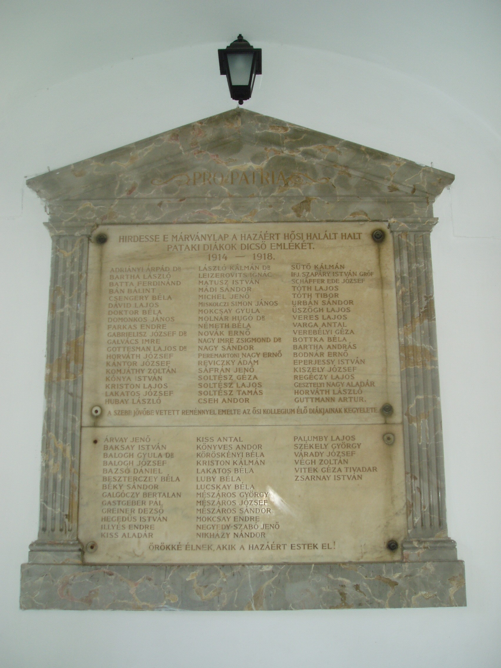 Nyilvános 987 | 1394 | Sárospatak, Rákóczi utca 1. Református Kollégium | A kollégium főépülete, a Nagy Kollégium a Rákóczi út északi végén található, mely 1804–1814 között korai klasszicista stílusban épült. Szép ráccsal ellátott, háromíves nyílású kapuzat vezet be az un. „nagyportá”-ba, amelyet két sor vaskos pillér három hajóra oszt. Kétoldalt a falakon az iskolatörténet néhány fontosabb eseményének, illetve a kollégium nagy alakjainak bronz domborművű ábrázolásait helyezték el. A képen az első világháború pataki diákáldozatainak emléktáblája látható. Az emlékmû két részletben készült, az első 1923-ban, a második 1928-ban. A fénykép 2007 augusztusában készült. Felh. irod.: Détsy Mihály: Sárospatak. Bp. Corvina, 1974 Látnivalók Borsod-Abaúj-Zemplén megyében. Miskolc, Well-PRess, 1995 www.sarospatak.hu/nevezetessegek |