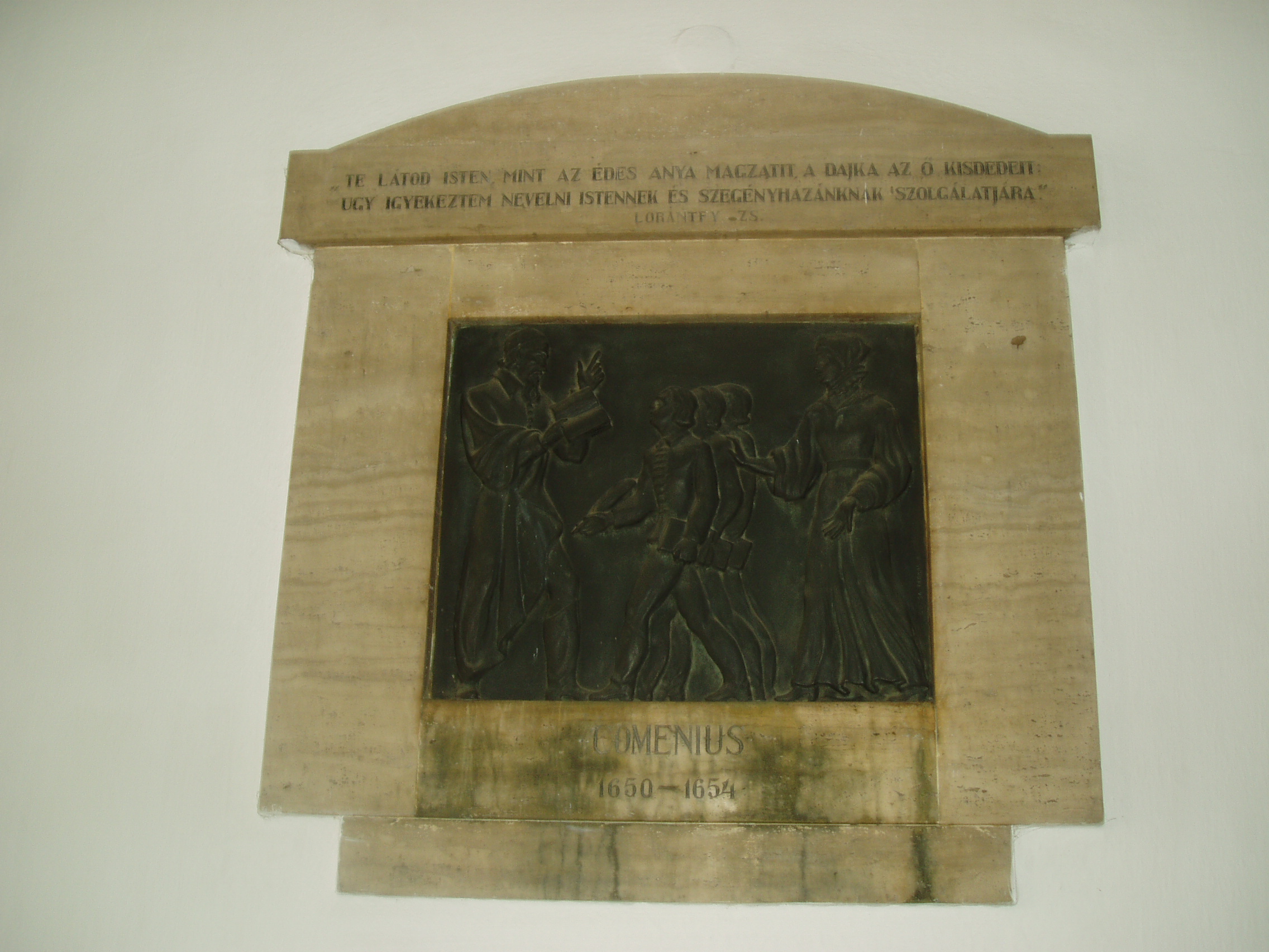 Nyilvános 984 | 1503 | Sárospatak, Rákóczi utca 1. Református Kollégium | A kollégium főépülete, a Nagy Kollégium a Rákóczi út északi végén található, mely 1804–1814 között korai klasszicista stílusban épült. Szép ráccsal ellátott, háromíves nyílású kapuzat vezet be az un. „nagyportá”-ba, amelyet két sor vaskos pillér három hajóra oszt. Kétoldalt a falakon az iskolatörténet néhány fontosabb eseményének, illetve a kollégium nagy alakjainak bronz domborművű ábrázolásait helyezték el. A képen Comenius (Jan Amos Comensky), a nagy pedagógus domborműve látható. Comenius 1650-től négy éven át működött Patakon I. Rákóczi György és felesége, Lorántffy Zsuzsanna felkérésére. Az 1937-ben felavatott dombormű alkotója Dózsa Farkas András. A fénykép 2007 augusztusában készült. Felh. irod.: Détsy Mihály: Sárospatak. Bp. Corvina, 1974 Látnivalók Borsod-Abaúj-Zemplén megyében. Miskolc, Well-PRess, 1995 www.sarospatak.hu/nevezetessegek |