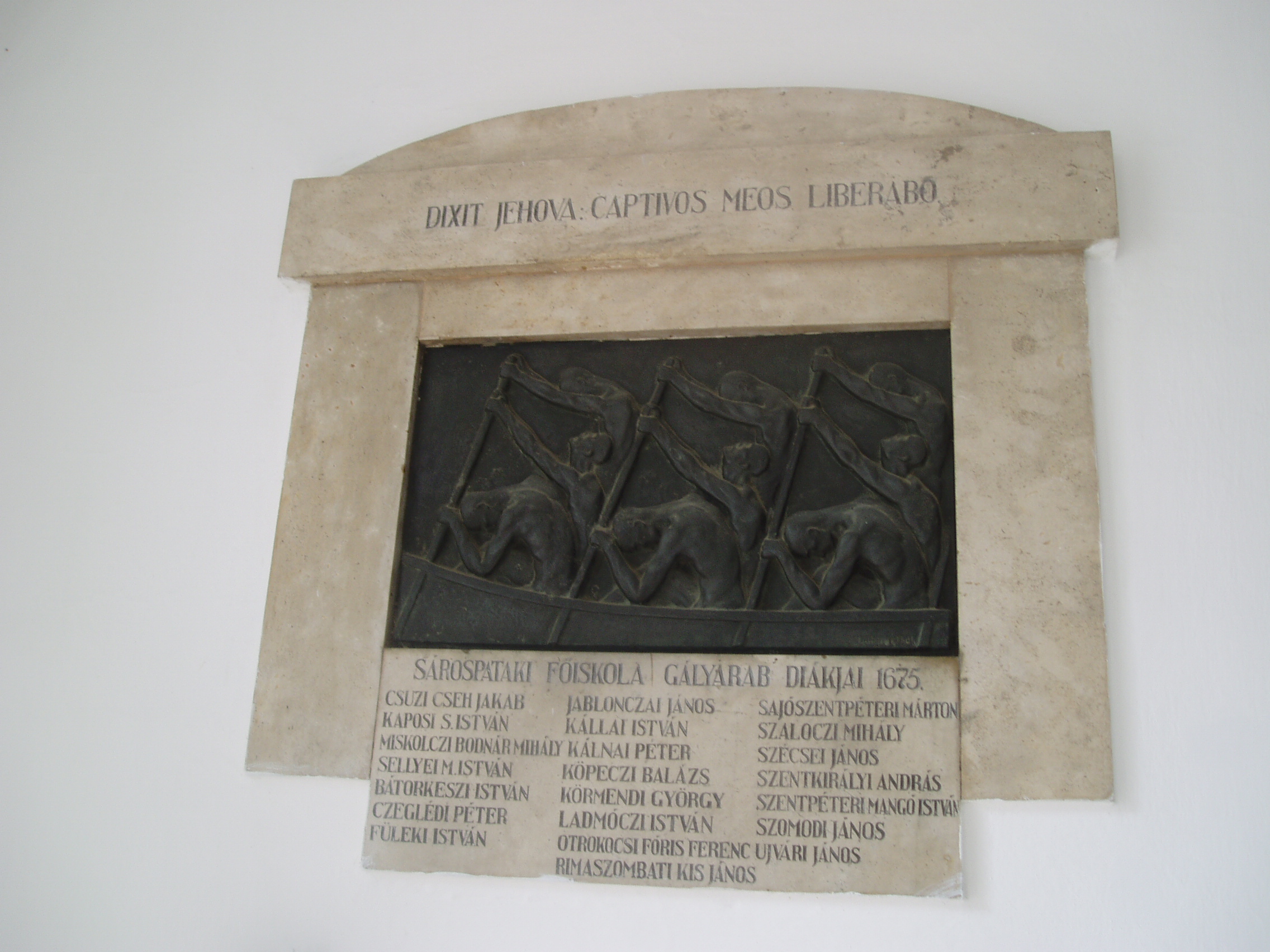 Nyilvános 980 | 1541 | Sárospatak, Rákóczi utca 1. Református Kollégium | A kollégium főépülete, a Nagy Kollégium a Rákóczi út északi végén található, mely 1804–1814 között korai klasszicista stílusban épült. Szép ráccsal ellátott, háromíves nyílású kapuzat vezet be az un. „nagyportá”-ba, amelyet két sor vaskos pillér három hajóra oszt. Kétoldalt a falakon az iskolatörténet néhány fontosabb eseményének, illetve a kollégium nagy alakjainak bronz domborművű ábrázolásait helyezték el. A képen a pataki kollégium gályarab diákjainak emléktáblája látható (Dabóczy Mihály alkotása, 1930-as évek vége). 1673-ban, a Wesselényi-összeesküvés (lásd: Sárospatak, Szent Erzsébet u. 19. Sub Rosa) leleplezése után I. Lipót császár református papokat és tanítókat ítélt gályarabságra. Közülük huszonketten pataki diákok voltak. Az ellenreformáció áldozatait 1676. február 11-én Ruyter holland admirális váltotta ki a rabságból és küldte haza (lásd még: Hajdú-Bihar megye/Debrecen, Emlékkert). A fénykép 2007 augusztusában készült. Felh. irod.: Détsy Mihály: Sárospatak. Bp. Corvina, 1974 Látnivalók Borsod-Abaúj-Zemplén megyében. Miskolc, Well-PRess, 1995 www.sarospatak.hu/nevezetessegek |