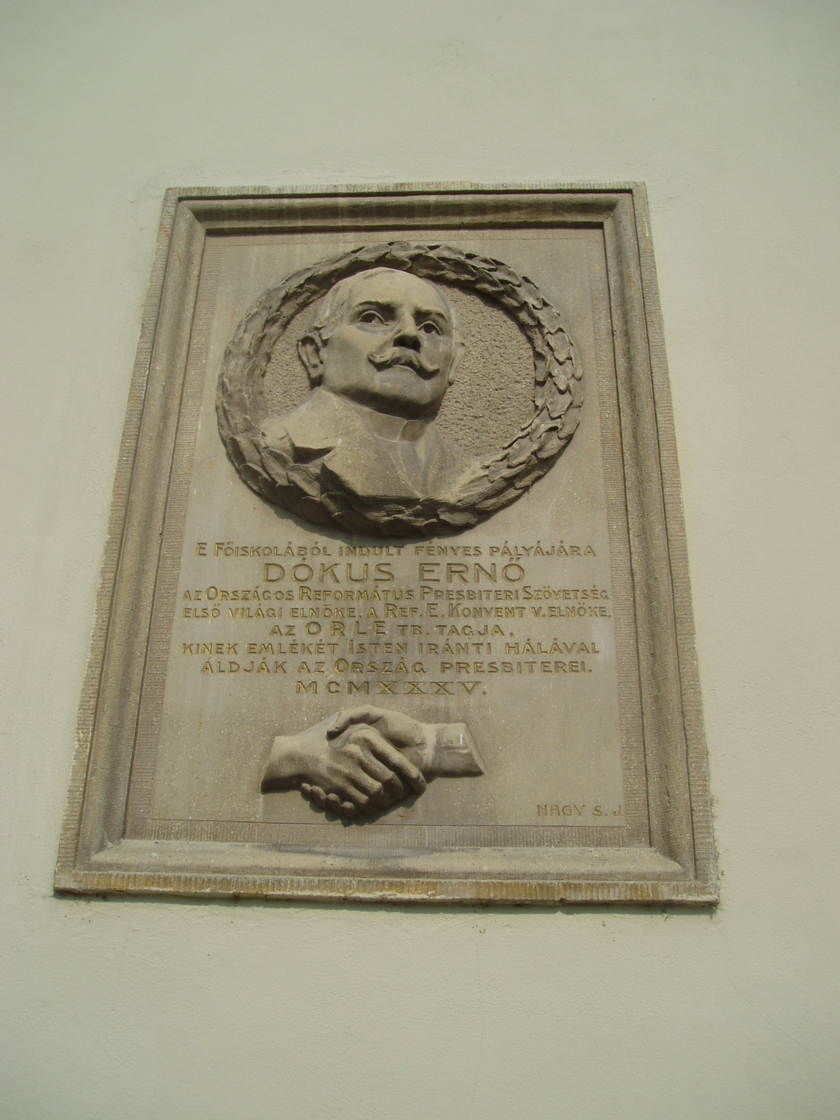 Nyilvános 987 | 1527 | Sárospatak, Rákóczi utca 1. Református Kollégium | A kollégium főépülete, a Nagy Kollégium a Rákóczi út északi végén található, mely 1804–1814 között korai klasszicista stílusban épült. Szép ráccsal ellátott, háromíves nyílású kapuzat vezet be az un. „nagyportá”-ba, amelyet két sor vaskos pillér három hajóra oszt. Kétoldalt a falakon az iskolatörténet néhány fontosabb eseményének, illetve a kollégium nagy alakjainak domborművű ábrázolásait helyezték el. A képen Dókus Ernő egykori pataki diák, az Országos Református Presbiteri Szövetség első világi elnöke domborműves emléktáblája látható. A fénykép 2007 augusztusában készült. Felh. irod.: Détsy Mihály: Sárospatak. Bp. Corvina, 1974 Látnivalók Borsod-Abaúj-Zemplén megyében. Miskolc, Well-PRess, 1995 www.sarospatak.hu/nevezetessegek |