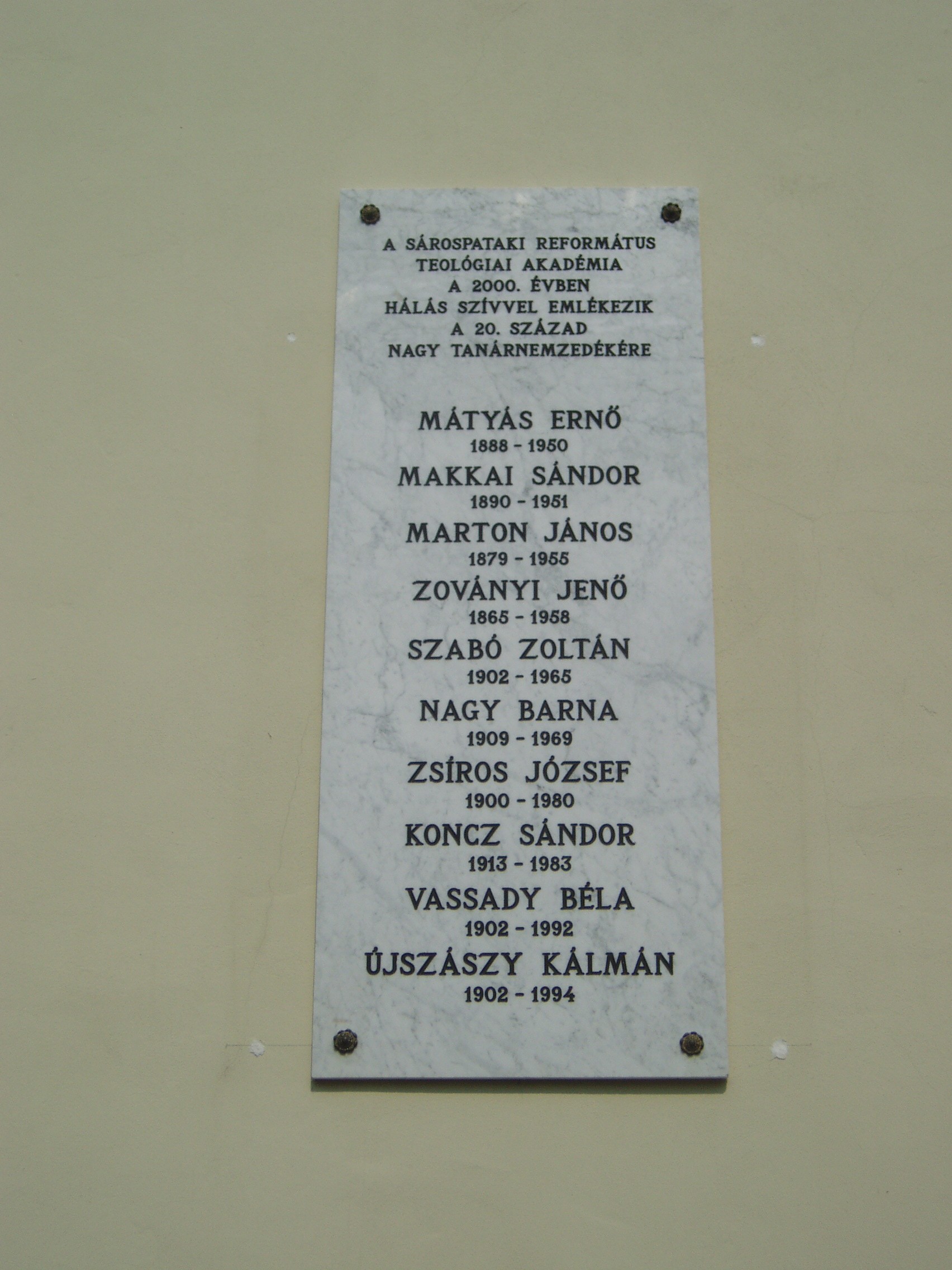 Nyilvános 953 | 1425 | Sárospatak, Rákóczi utca 1. Református Kollégium | A Kollégium főépületének szárnyai által határolt tágas udvarban áll a régi iskolaépületek utolsó maradványa, az ún. Berna-sor. Északi falán 2000-ben helyezték el a pataki Református Jogakadémia nagy XX. századi tanárnemzedékének emléktábláját. A fénykép 2007 augusztusában készült. |