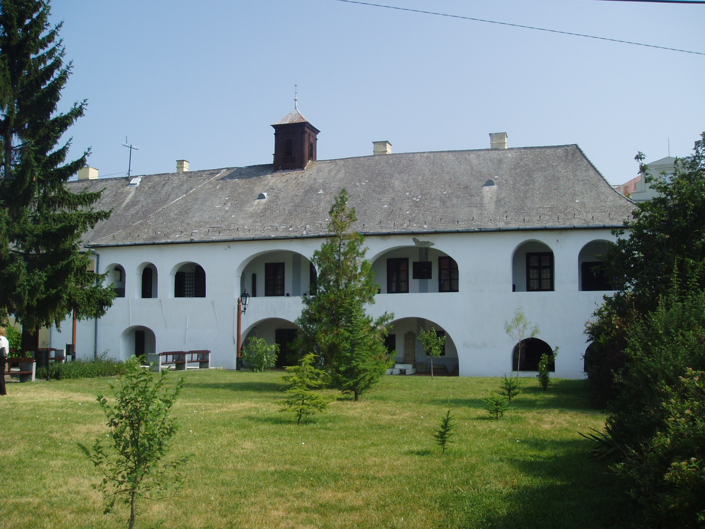 Nyilvános 928 | 1448 | Sárospatak, Rákóczi utca 1. Református Kollégium | A Kollégium főépületének szárnyai által határolt tágas udvarban áll a régi iskolaépületek utolsó maradványa, az ún. Berna-sor. 1771/72-ben a fizika oktatása számára és a fizikaprofesszor lakásául épült. Az egyemeletes, hosszú szárny déli oldalát később kétszintes, árkádos tornáccal bővítették, feljáróval a nyugati oldalon. Az épület a korabeli provinciális magyar építészet szép példája. Az emelet boltozott termeiben a kollégium történetét bemutató kiállítás látható. A fénykép 2007 augusztusában készült. Felh. irod.: Détsy Mihály: Sárospatak. Bp. Corvina, 1974 |
