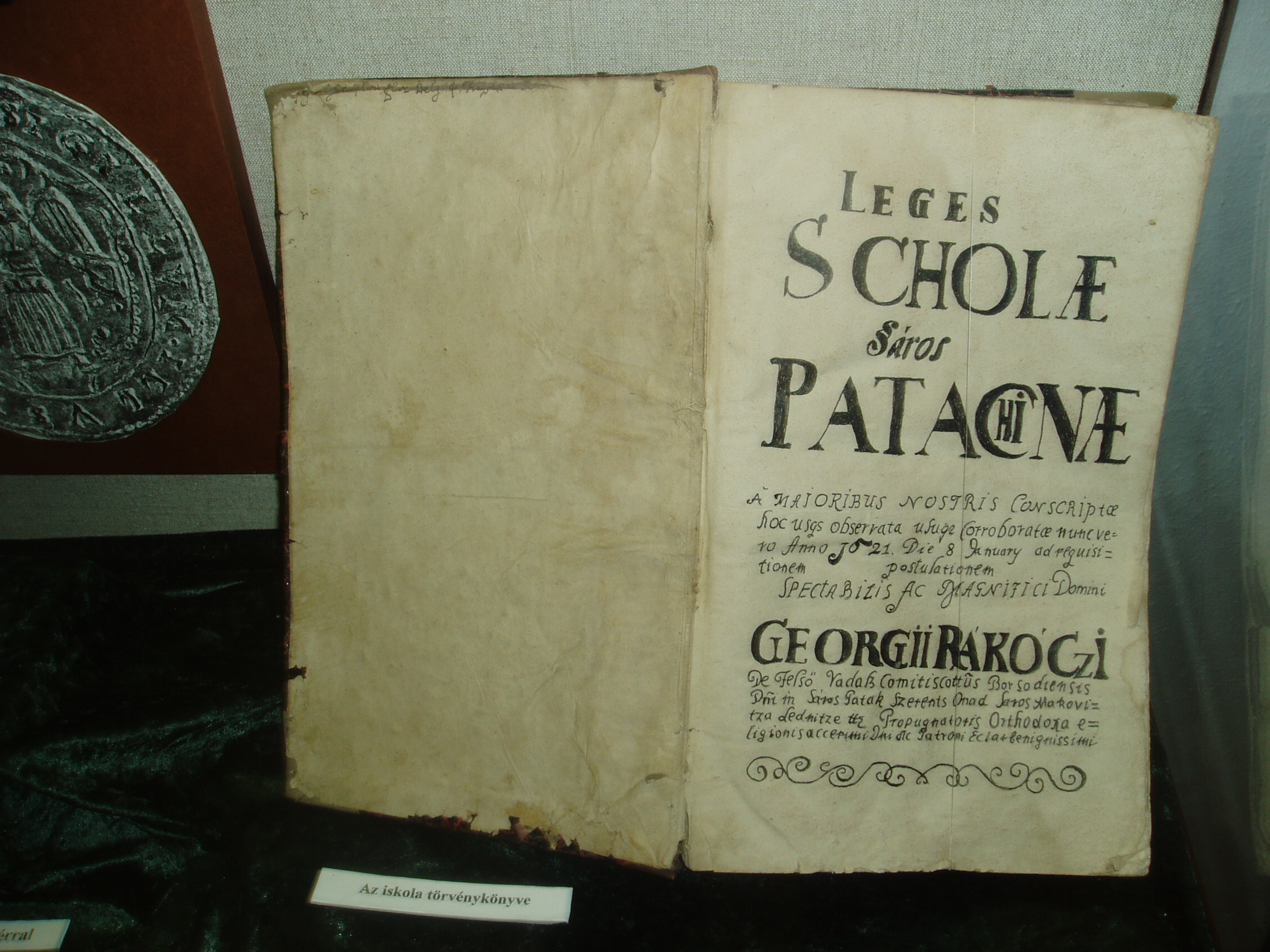Nyilvános 940 | 1388 | Sárospatak, Rákóczi utca 1. Református Kollégium | A Kollégium főépületének szárnyai által határolt tágas udvarban áll a régi iskolaépületek utolsó maradványa, az ún. Berna-sor. 1771/72-ben a fizika oktatása számára és a fizikaprofesszor lakásául épült. Az egyemeletes, hosszú szárny déli oldalát később kétszintes, árkádos tornáccal bővítették, feljáróval a nyugati oldalon. Az épület a korabeli provinciális magyar építészet szép példája. Az emelet boltozott termeiben a kollégium történetét bemutató kiállítás látható. A képen a Református Kollégium 1621-ből származó Törvénykönyve látható. A fénykép 2007 augusztusában készült. |
