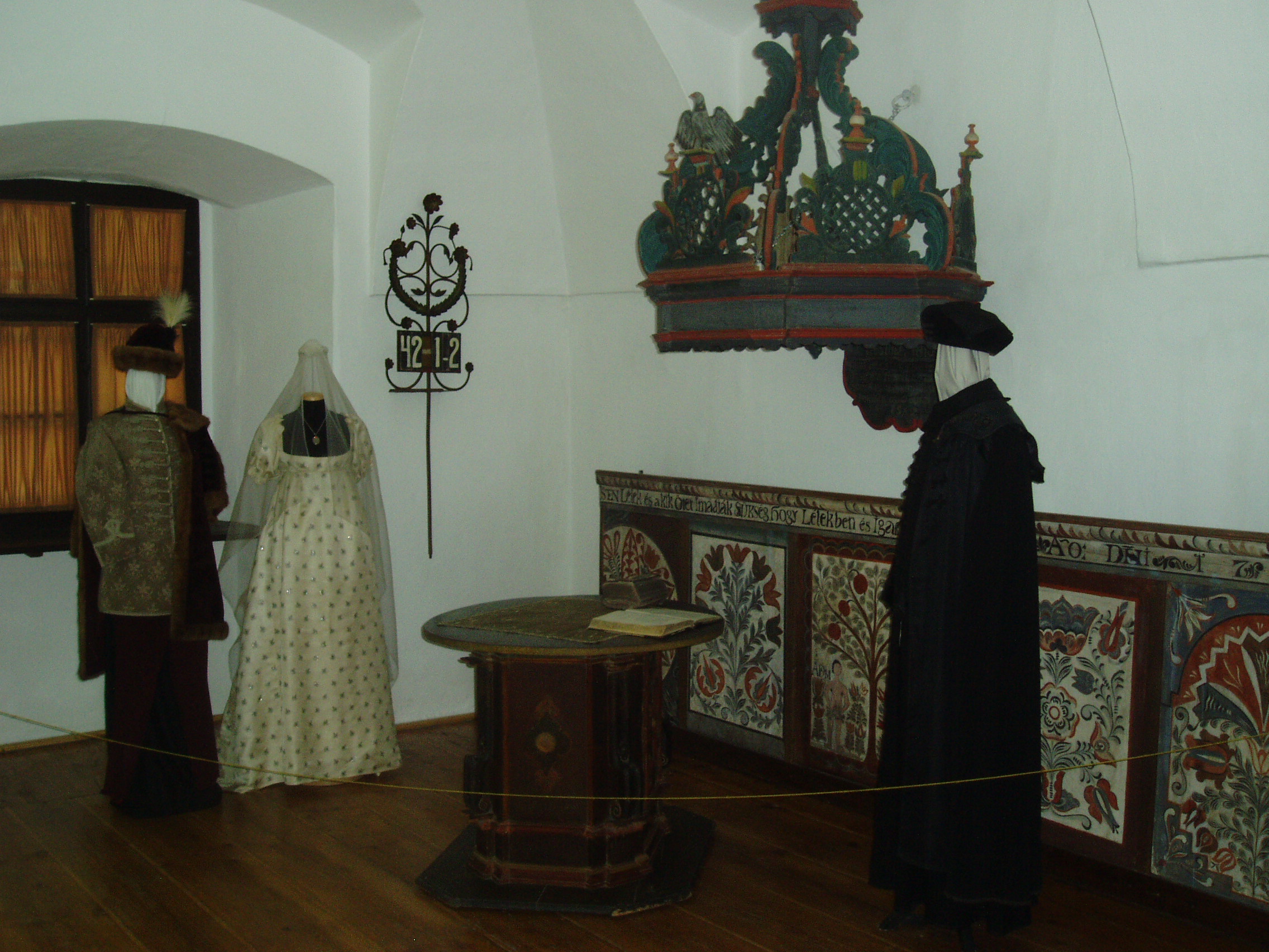 Nyilvános 980 | 1460 | Sárospatak, Rákóczi utca 1. Református Kollégium | A Kollégium főépületének szárnyai által határolt tágas udvarban áll a régi iskolaépületek utolsó maradványa, az ún. Berna-sor. 1771/72-ben a fizika oktatása számára és a fizikaprofesszor lakásául épült. Az egyemeletes, hosszú szárny déli oldalát később kétszintes, árkádos tornáccal bővítették, feljáróval a nyugati oldalon. Az épület a korabeli provinciális magyar építészet szép példája. Az emelet boltozott termeiben a kollégium történetét bemutató kiállítást rendeztek be. A képen az egyházművészeti gyűjtemény legszebb darabjai láthatók, egy korabeli esküvőt rekonstruálva. A fénykép 2007 augusztusában készült. Felh. irod.: Détsy Mihály: Sárospatak. Bp. Corvina, 1974 |