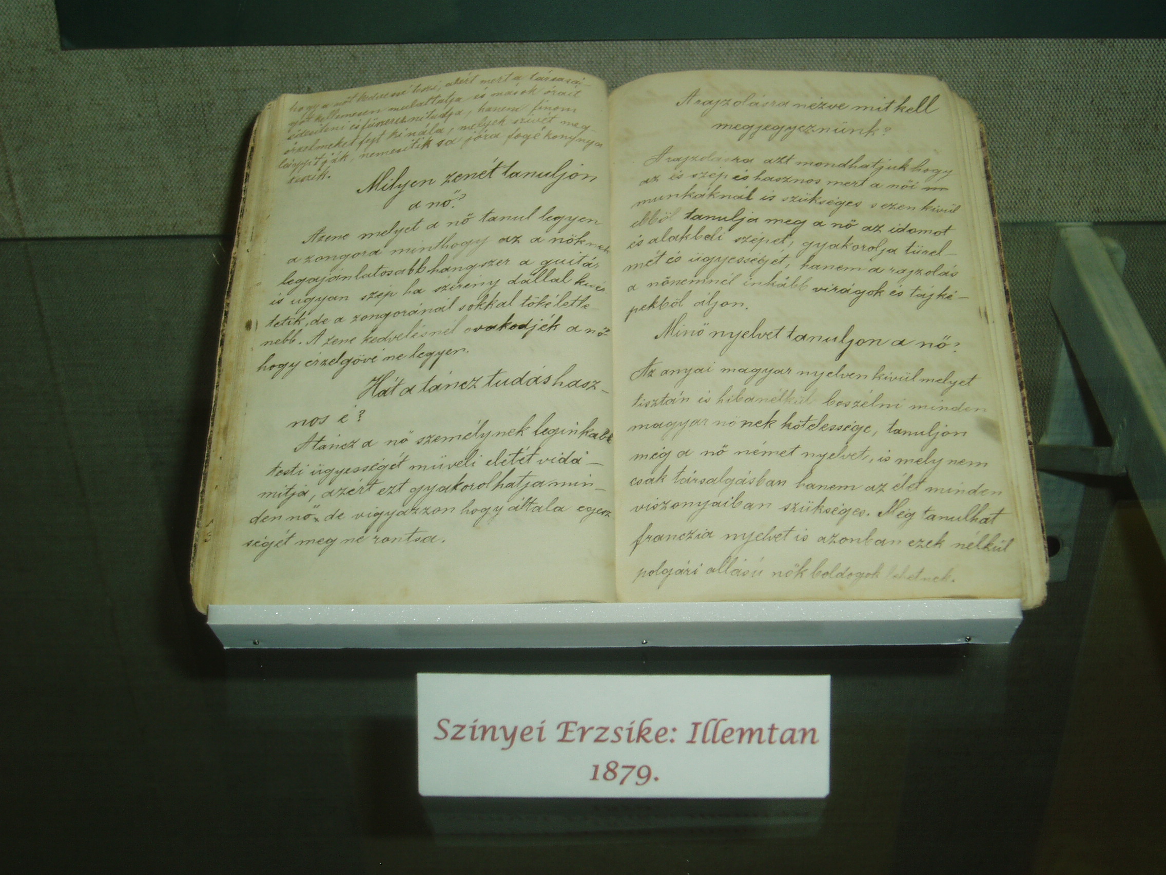 Nyilvános 949 | 1439 | Sárospatak, Rákóczi utca 1. Református Kollégium | A Kollégium főépületének szárnyai által határolt tágas udvarban áll a régi iskolaépületek utolsó maradványa, az ún. Berna-sor. 1771/72-ben a fizika oktatása számára és a fizikaprofesszor lakásául épült. Az egyemeletes, hosszú szárny déli oldalát később kétszintes, árkádos tornáccal bővítették, feljáróval a nyugati oldalon. Az épület a korabeli provinciális magyar építészet szép példája. Az emelet boltozott termeiben a kollégium történetét bemutató kiállítást rendeztek be. A képen egy XIX. századi fiatal lány, Szinnyei Erzsike 1879-ben kézzel írt illemtankönyve látható. A fénykép 2007 augusztusában készült. Felh. irod.: Détsy Mihály: Sárospatak. Bp. Corvina, 1974 |