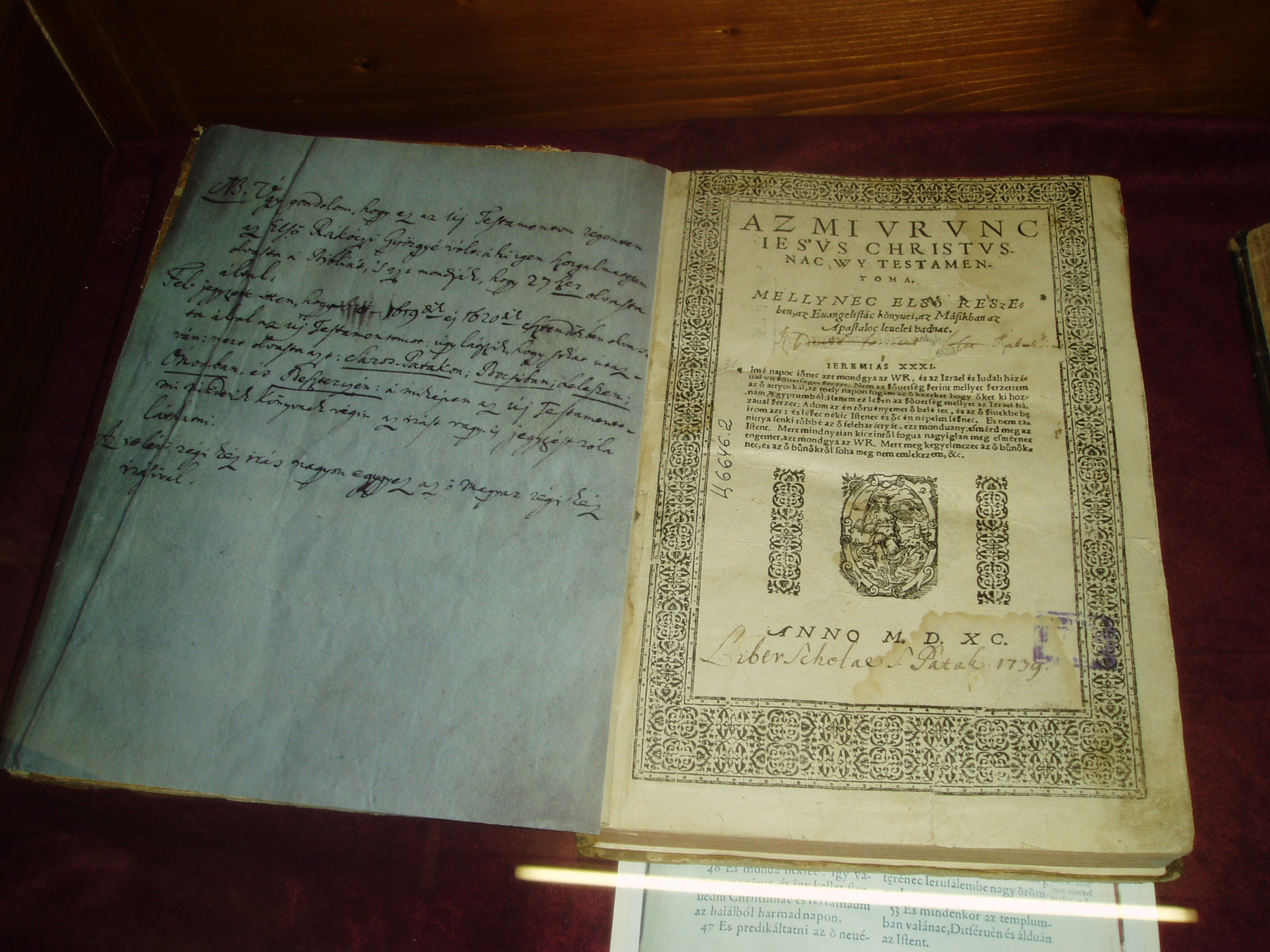 Nyilvános 961 | 1460 | Sárospatak, Rákóczi utca 1. Református Kollégium könyvtára | Az 1531-ben alapított Sárospataki Református Kollégium könyvtára évszázadok óta az ország egyik legértékesebb könyvgyűjteménye. Az iskola létrehozásától kezdve a tudós professzorok és a hallgatók közös igénye, illetve a város birtokosai és a külföldet járt diákok adományai alakították. A könyvtár egyik nagy kincse az 1590-ből származó Vizsolyi Biblia egyik példánya. Károli Gáspár, a gönci tudós református lelkész, miután feleségét és gyermekeit egy pestisjárványban elveszítette, 1586-ban kezdett neki a Biblia teljes fordításának. Kinyomtatásához Mantskovit Bálint e célból Vizsolyba telepített nyomdája Németalföldről új betűket kapott, a papírt Lengyelországból hozták. A nyomtatást 1589. február 18-án kezdték, és másfél év múlva, 1590. július 20-án fejezték be. A szedőknek négy és fél millió betűt kellett a papíron elhelyezniük. A nyomtatás már a fordítás alatt megkezdődött, a frissen elkészült részeket szinte laponként vitte a futár Göncről Vizsolyba. Az eredeti kiadásból 52 példány maradt fenn, közülük 24 külföldön van. Három példány az Országos Széchényi Könyvtárban található, egyet Sárospatakon, egyet a vizsolyi templomban őriznek. A vizsolyi Biblia nemcsak a magyar reformáció megerősödését és a könyvnyomtatás meghonosodását, hanem a magyar irodalmi nyelv tökéletesedését is jelentette. Károli fordítását kisebb változtatásokkal közel háromszáz kiadásban nyomtatták újra. A magyar irodalmi nyelv alakulására gyakorolt hatása szinte felmérhetetlen. A fénykép 2007 augusztusában készült. Felh. irod.: www.gradatio.hu/nagykonyvtar 415 éves a vizsolyi Biblia. = Evangélikus Élet 2005. 31. |