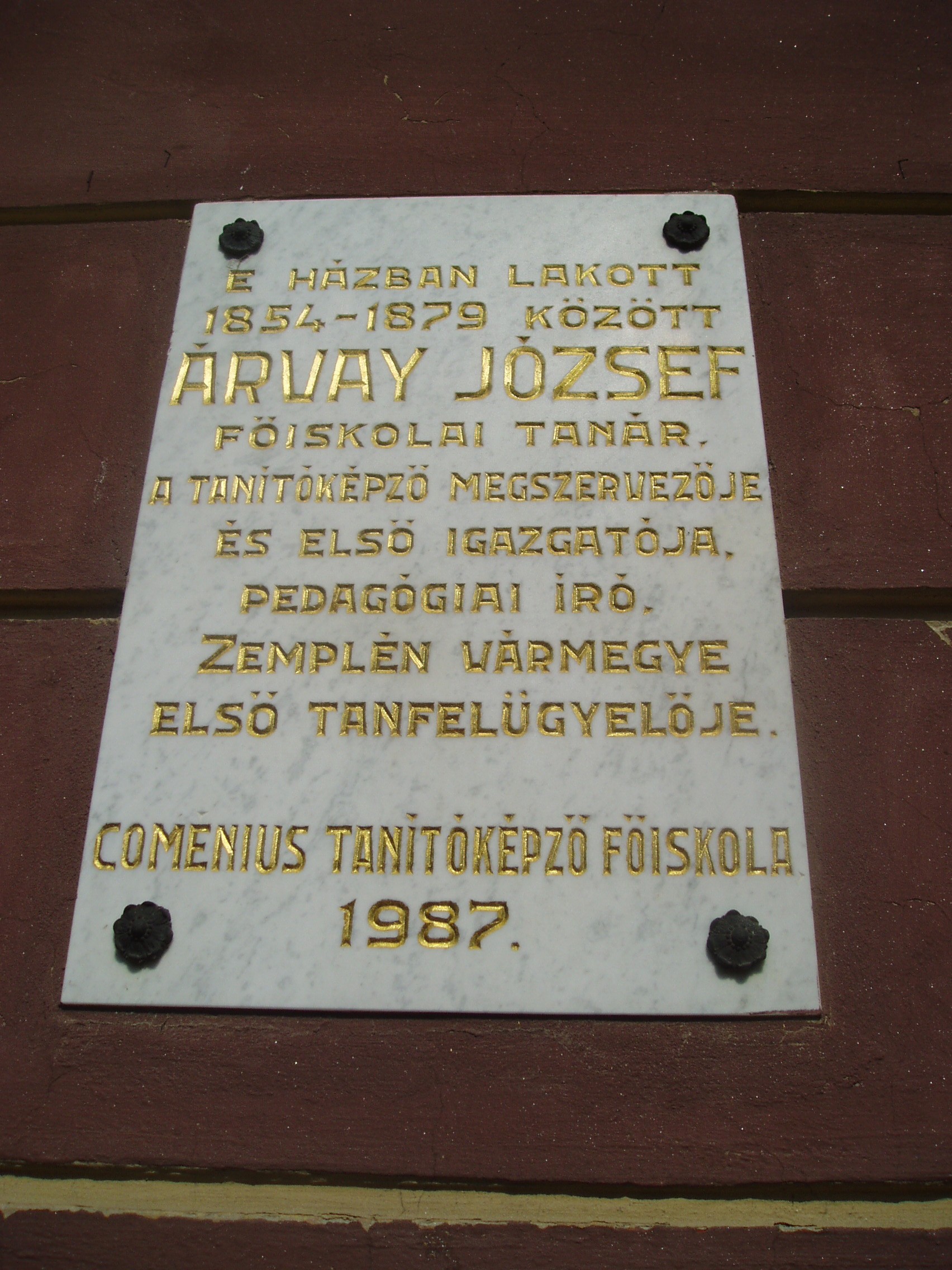 Nyilvános 953 | 1468 | Sárospatak, Rákóczi utca 12. | A műemlék jellegű lakóház a XIX. század első felében épült későbarokk stílusban. 1854 és 1879 között itt lakott Árvay József (1823-1879) matematika szakos főiskolai tanár, korábbi pataki diák. Ő volt az 1859-ben felállított taítóképző intézet első igazgatója és Zemplén vármegye első tanfelügyelője. Tankönyvírással is foglalkozott. A fénykép 2007 augusztusában készült. Felh. irod.: www.wikipedia.org |