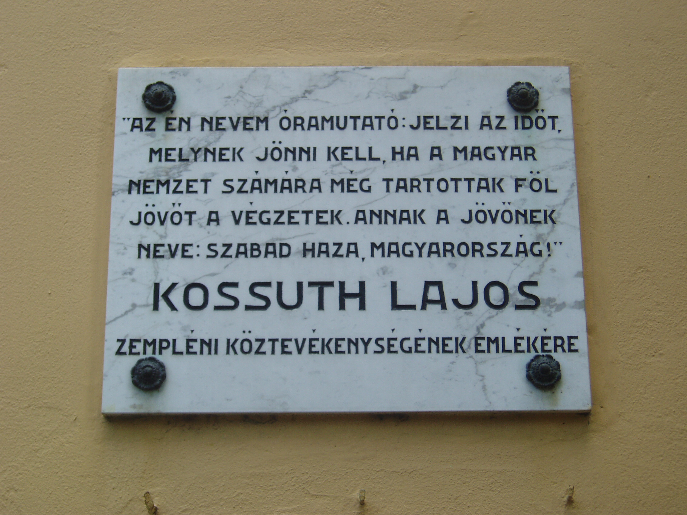 Nyilvános 976 | 1802 | Sátoraljaújhely, Kossuth tér 5. | A városháza (volt megyeháza) a fő tér hangulatát meghatározó barokk stílusban épült 1754-1768 között. Az olasz építészek által tervezett épület impozáns méreteivel az állandóság és a méltóság érzetét kelti. A főbejárat fölötti erkély mögötti díszteremben mondta a fiatal Kossuth első szónoklatát 1831-ben, a koleralázadás idején (az útikönyvekben a beszéd helyeként következetesen az erkélyt említik). Kossuth Lajos szülei 1808. február végén Olaszliszkáról költöztek Újhelybe. 1810 és 1816 között a város piarista gimnáziumának növendéke volt. 1824-ben Pestet otthagyva visszatért Újhelyre, ahol magánügyvédként dolgozott. 1827-ben Zemplén megye táblabírája, 1830-ban Sátoraljaújhely, 1832-ben a vármegye ügyésze lett. Közéleti szereplése 1831-ben a vármegyei közgyűlésen a kolerajárvány kapcsán a jobbágyság társadalmi helyzetéről elmondott beszédével kezdődött. Kossuth többször is felszólalt az épületben, az akkori megyeházán, mint a formálódó ellenzék egyik vezérszónoka. Szokatlan és merész szónoklatait szemtanúként az idős Kazinczy Ferenc is felemlegette levelezésében. Egyik protestáló felszólalását így örökítette meg: "Erre felkele Kossuth Lajos, s oly tűzzel, mintha kezében volna a zendítés szövétneke, két kezét csípejére rakván, képzelhetetlen vakmerőséggel tartá beszédét." Kossuth sátoraljaújhelyi emlékét utca, tér, szobor, több intézmény és emléktábla őrzi. Emléktábla található egykori iskolája falán (lásd: Sátoraljaújhely, Deák F. u. 10-12.), a városháza dísztermében, illetve azon házakon, ahol egykor ő, illetve szülei, testvérei laktak (lásd: Sátoraljaújhely, Móricz Zs. u. 17. és Hősök tere 8.). A fénykép 2007 augusztusában készült. Felh. irod.: Látnivalók Borsod-Abaúj-Zemplén megyében. Miskolc, Well-PRess, 2003 www.satoraljaujhely.hu/nevezetessegek www.vendegvaro.hu Fehér József: Két újhelyi Kossuth-legenda. = Széphalom. A Kazinczy Társaság Évkönyve 12. kötet, 2002 |