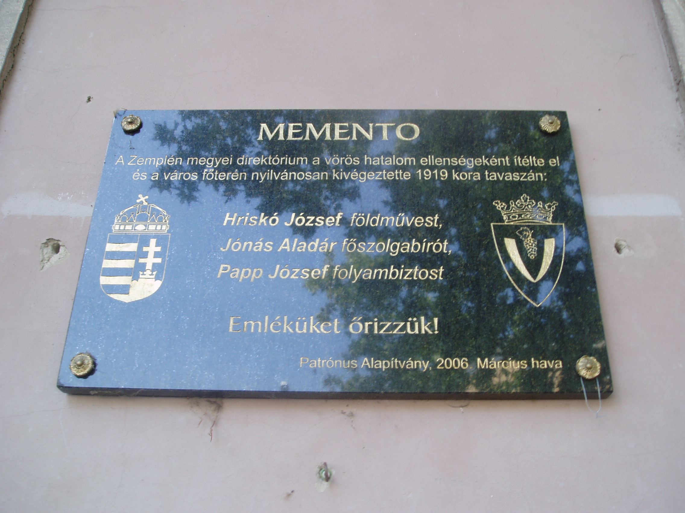 Nyilvános 980 | 1531 | Sátoraljaújhely, Kossuth tér 18. | Ezen az épületen örökítették meg Hriskó József földműves, Jónás Aladár főszolgabíró és Papp József folyambiztos emlékét, akiket 1919 kora tavaszán a Zemplén megyei direktórium mint a vörös hatalom ellenségeit nyilvánosan kivégeztette itt, a város főterén. A fénykép 2007 augusztusában készült. |