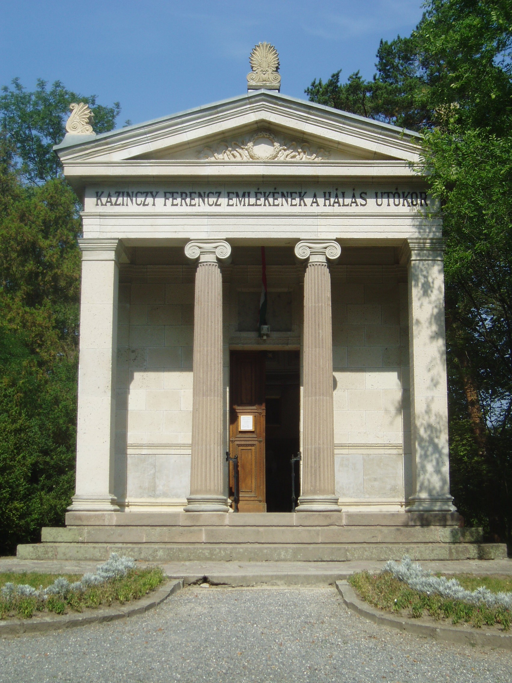 Nyilvános 990 | 1556 | Széphalom: Kazinczy Ferenc Emlékcsarnok (Mauzóleum) | A Sátoraljaújhely központjától 5 km-re található, ma a városhoz csatolt Széphalom neve egykor Kisbányácska volt; a nyelvújító Kazinczy Ferenc nevezte el Széphalomnak. Valaha körülbelül ezen a helyen állt Kazinczy kúriája, amelyet irodalmunk nagy alakja 1794-ben kezdett el építeni. A következő évben letartóztatták a magyar jakobinus mozgalomban betöltött szerepe miatt. Előbb halálra, majd várfogságra ítélték több helyen, köztük Kufsteinben és Munkácson raboskodott. Több, mint 7 év után, 1801-ben kapott kegyelmet. 1804-ben költözött Széphalomra feleségével, Török Sophie-vel, s haláláig itt élt gyarapodó családja körében - sajnos, élete végéig anyagi gondok között. Innét irányította az irodalmi életet két évtizeden át, s ezzel a kis települést a magyar irodalmi-politikai gondolkodás egyik központjává tette. Óriási levelezése folytán Kazinczy a kor valamennyi jelentős gondolkodójával kapcsolatban állt, itt futottak össze a haladó társadalmi eszmék, az irodalmi reformtörekvések és a nyelvújítási folyamatok. 1815-től élete végéig Zemplén megye levéltárnokaként tevékenykedett (lásd: Sátoraljaújhely, Kossuth tér 5.). Széphalmi otthonában halt meg 1831. augusztus 22-én, a környéken pusztító kolerajárvány áldozataként. A közelben lévő családi temetőben helyezték örök nyugalomra (lásd a 04-10. képeket). Nyughelye már a reformkorban zarándokhely lett. 1859-ben, születése centenáriumának évében a Magyar Tudományos Akadémia megvásárolta a széphalmi kúria kertjét, s 1873-ra felépítették egykori otthona helyén Ybl Miklós tervei szerint a görög templomot mintázó Kazinczy Ferenc Emlékcsarnokot. A fénykép 2007 augusztusában készült. Felh. irod.: Sátoraljaújhely-Széphalom: A Magyar Nyelv Múzeuma (szórólap, 2006 k.) www.vendegvaro.hu |