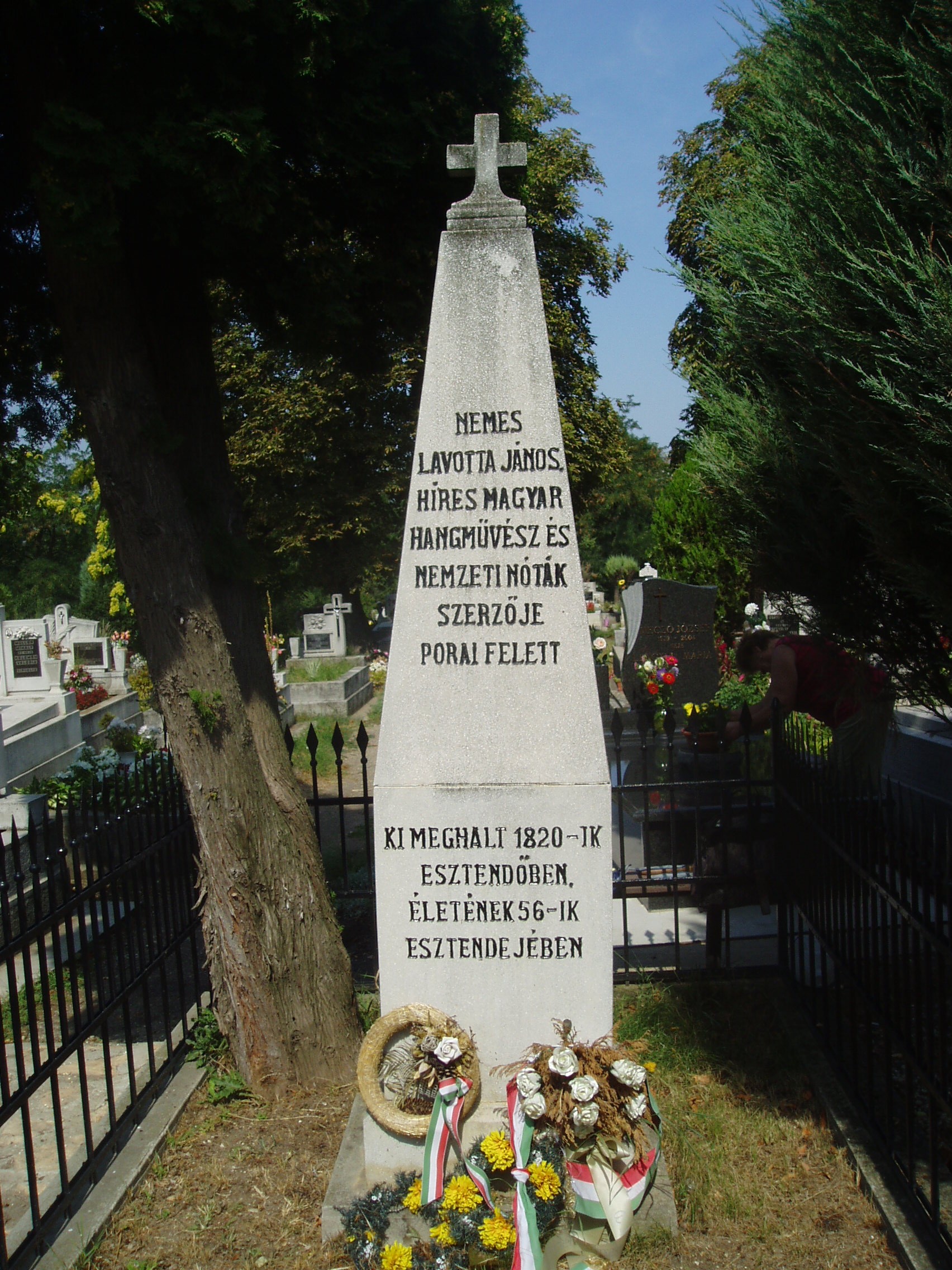 Nyilvános 1083 | 2083 | Tállya, Temető: Lavotta János sírja | Az 1820. augusztus 11-én - családtalanul - Tállyán elhunyt (lásd: Tállya, Rákóczi u. 24.) Lavotta Jánost nagy pompával, több vármegye urának részvételével helyezték örök nyugalomra a helyi temetőben. A hagyomány szerint hegedűjét is koporsójába tették. Temetésén zenekarával a verbunkos másik kiemelkedő képviselője, Bihari János játszott. Síremlékét, amely ma helyreállított állapotban látható, 1831-ben egy tisztelője, Újfalussy Mihály emelte. A verbunkos-triász egyik nagy mesterének tiszteletére a közelmúltban a Maillot-kastélyban emlékszobát rendeztek be (lásd: Tállya, Rákóczi u. 10.). Emlékét a település központjában felállított obeliszk (lásd: Tállya, Rákóczi u. 34.) is őrzi. A fénykép 2007 augusztusában készült. Felh. irod.: Szilágyi Sándor: Lavotta János. Bp. 1930. Dombóvári János: Pusztafedémestől Tállyáig. Miskolc, Szent Maximilian Kiadó, 1994 www.tallya.hu Takács Péter: Tállya. Bp. Száz Magyar Falu Könyvesháza Kht., 2001. /Száz magyar falu könyvesháza/ |