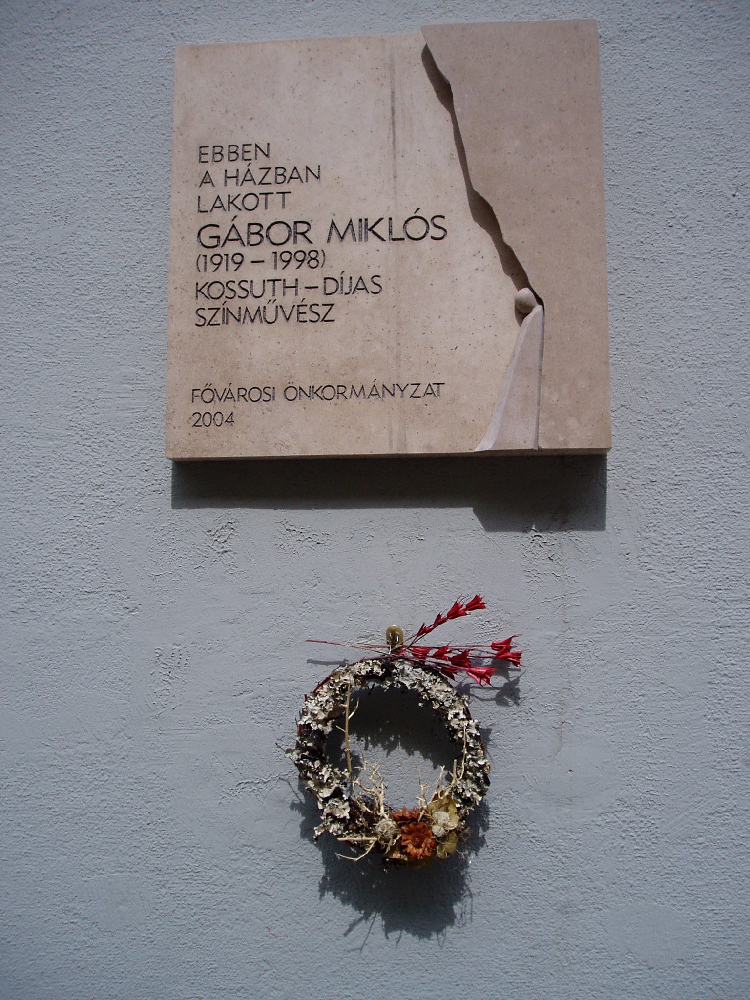 Nyilvános 1085 | 1620 | Budapest, XIII. Katona József utca 27. | Hosszú évtizedeken keresztül lakott ebben a házban Gábor Miklós (1919-1998) színművész, író, rendező. Zalaegerszegen született 1919. április 7-én (lásd: Zalaegerszeg, Ady u. 9.). Szuggesztív, töprengő alkatú színész volt, aki rendkívüli stílusérzékkel alakította a magyar és a világirodalom bonyolult szerepeit. Legnagyobb alakításának Shakespeare Hamletjének megformálását tartják, akinek jelmezében több, mint háromszázszor lépett színpadra a Madách Színházban az 1960-as években. Az 1970-es évek közepén - országos feltűnést keltve - Kecskemétre szerződött, ahol Ruszt Józseffel máig legendás előadásokat hoztak létre (Don Carlos, Bereniké, Boldogtalan hold, VII. Gergely). Ugyancsak Ruszt József rendezésében Lucifert formálta meg Az ember tragédiájában szülővárosa, Zalaegerszeg új színházának színházavató előadásán. Gábor Miklós számos könyvet is publikált, amelyekben kíméletlen őszinteséggel ír gondolatairól, érzéseiről, vívódásairól, színházról, életről (Tollal, A színész árnyéka, Kos a mérlegen, Kicsi-világ-háború, Egy csinos zseni, Sánta szabadság) Emléktábláját születésének 85. évfordulója alkalmából Trokán Péter, egykori kecskeméti kollégája avatta fel 2004. április 5-én. A fénykép 2005 májusában készült. |