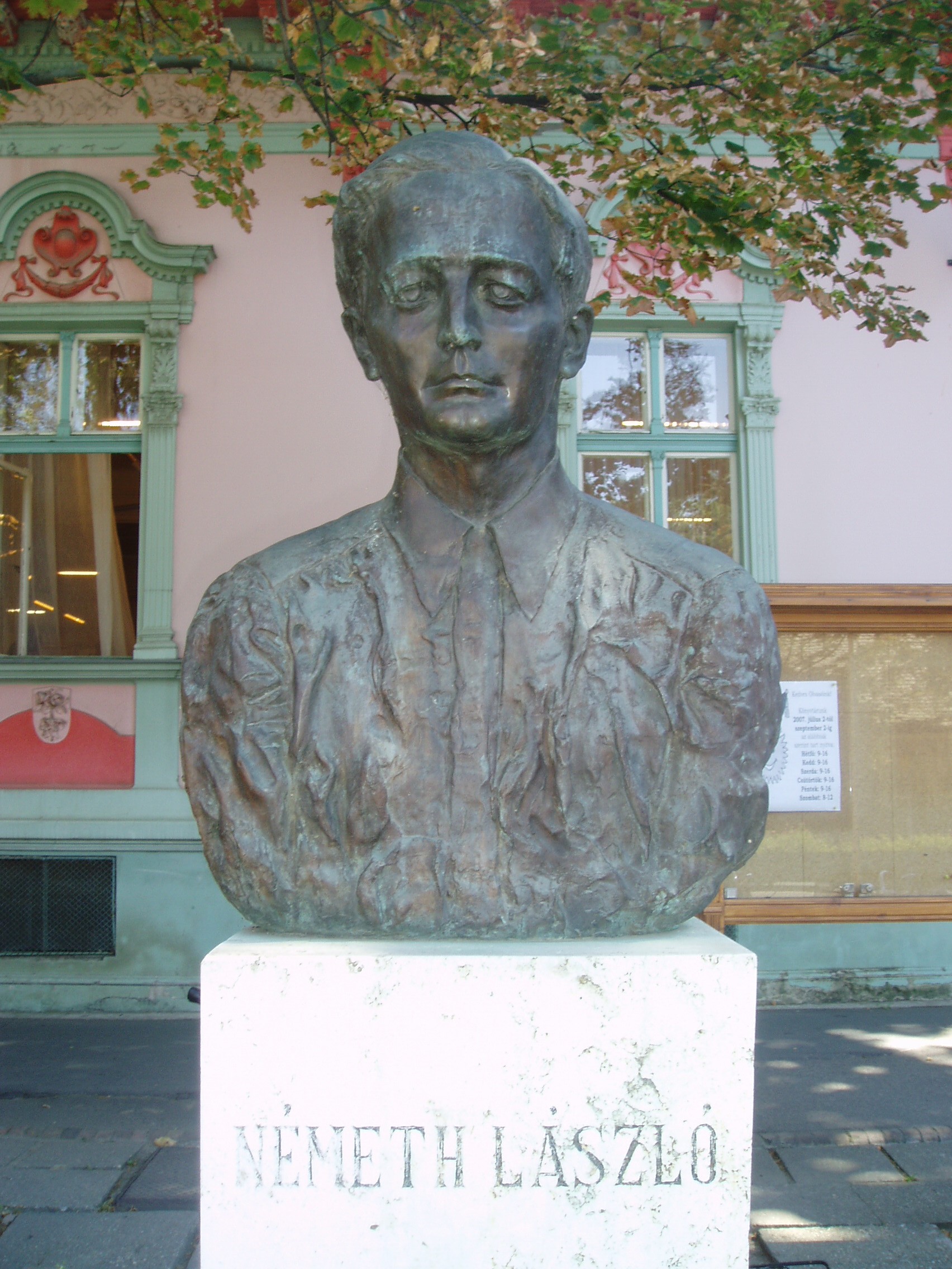 Nyilvános 1375 | 2994 | Hódmezővásárhely, Andrássy út 44. Németh László mellszobra a Németh László Városi Könyvtár előtt | A könyvtárat 1880-ban alapította a város közgyűlése. A vásárhelyi kötődésű nagy író nevét 1976-ban vette fel. Németh László a második világháborút követően több évig élt a városban. Irodalmat és matematikát tanított, s írói munkássága is rendkívül termékeny volt. Több művében, így például az Égető Eszterben is feldolgozta a vásárhelyi polgárok életét. A könyvtár épülete előtt Tóth Valéria által készített mellszobra, az épületben pedig emlékszoba idézi a XX. század egyik legnagyobb gondolkodójának szellemiségét. A Németh László Városi Könyvtár helyismereti különgyűjteménye négyezer olyan kötetet tartalmaz, amely vásárhelyi szerző műve, vagy a városról szól. A gyűjtemény őrzi többek között József Attila Medvetánc című kötetének első kiadását. A könyvritkaságok közül említést érdemel Szenci Molnár Albert (1574-1634) 1608-ban kiadott Szent Bibliája. A fénykép 2007 júliusában készült. Felh. irod.: Arató László - Bátyi Zoltán: Hódmezővásárhely az alföldi művészváros. Hódmezővásárhely, 2004 www.hodmezovasarhely.hu www.nlvk.hu/emlekszoba.php |