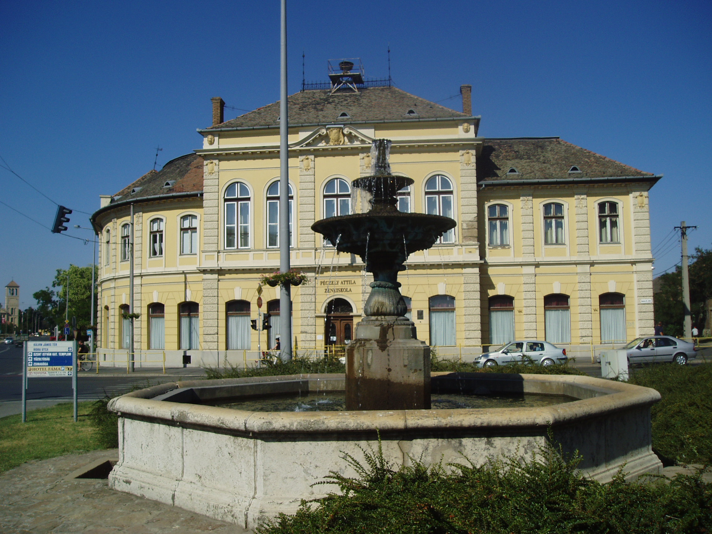 Nyilvános 1350 | 2991 | Hódmezővásárhely, Kálvin tér 4. | Az impozáns, eklektikus és reneszánsz jegyeket hordozó középület eredetileg a zsidó hitközség székháza volt. 1893-ban kezdték építeni Petrecz Pál tervei szerint. Benne a hitéleti helyiségek mellett 1894-ben nyílt meg a Központi szálloda, ám a helybeliek inkább "zsidó kávéháznak" nevezték a sok kulturális rendezvénynek otthont adó épületet. A zsidóság deportálása után leventeotthonként, majd MADISZ székházként funkcionált. 1957-ben költözött ide a városi zeneiskola, amely ma a kiváló, évtizedeken át Vásárhelyen élt orvos-népzenekutató-muzeológus Péczely László nevét viseli. Az épület előtt, a Kálvin tér közepén Nagy András János kútja áll. Az öntöttvas díszkút lefelé nagyobbodó tányérjaival a toszkán kutakat idézi. Ez az Alföld egyik legrégibb kútja, 1884-ben fúrta Zsigmondy Vilmos elgondolásai alapján Zsigmondy Béla. Mint a talapzatán elhelyezett táblán olvasható, a kút költségeit egy helybeli házaspár állta. A kút több, mint 250 méter mély, borovi fenyőből készített csövén hajdan 694 liter víz jött fel percenként. Miután fokozatosan elapadt, a városi vezetékre kapcsolták. A fénykép 2007 júliusában készült. Felh. irod.: Barangolások Csongrád megyében. Miskolc, Well-PRess, 1997 /Vendégváró/ Arató László - Batyi Zoltán: Hódmezővásárhely az alföldi művészváros. Hódmezővásárhely, 2004 |