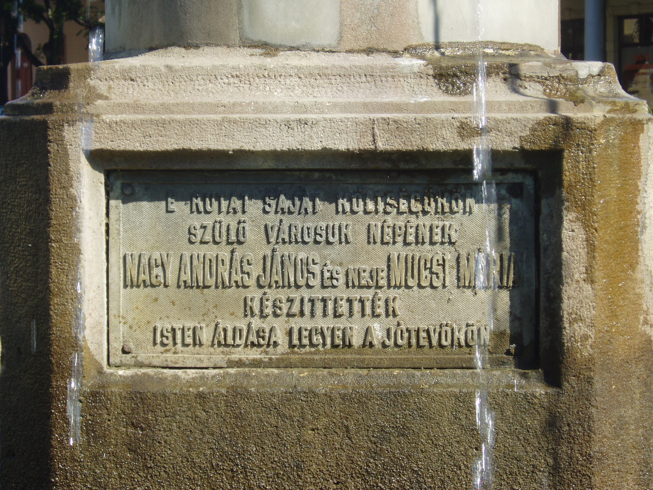 Nyilvános 1340 | 2858 | Hódmezővásárhely, Kálvin tér: Díszkút | A Kálvin tér közepén Nagy András János kútja áll. Az öntöttvas díszkút lefelé nagyobbodó tányérjaival a toszkán kutakat idézi. Ez az Alföld egyik legrégibb kútja, 1884-ben fúrta Zsigmondy Vilmos elgondolásai alapján Zsigmondy Béla. Mint a talapzatán elhelyezett táblán olvasható, a kút költségeit egy helybeli házaspár állta. A kút több, mint 250 méter mély, borovi fenyőből készített csövén hajdan 694 liter víz jött fel percenként. Miután fokozatosan elapadt, a városi vezetékre kapcsolták. A fénykép 2007 júliusában készült. Felh. irod.: Barangolások Csongrád megyében. Miskolc, Well-PRess, 1997 /Vendégváró/ Arató László - Batyi Zoltán: Hódmezővásárhely az alföldi művészváros. Hódmezővásárhely, 2004 |