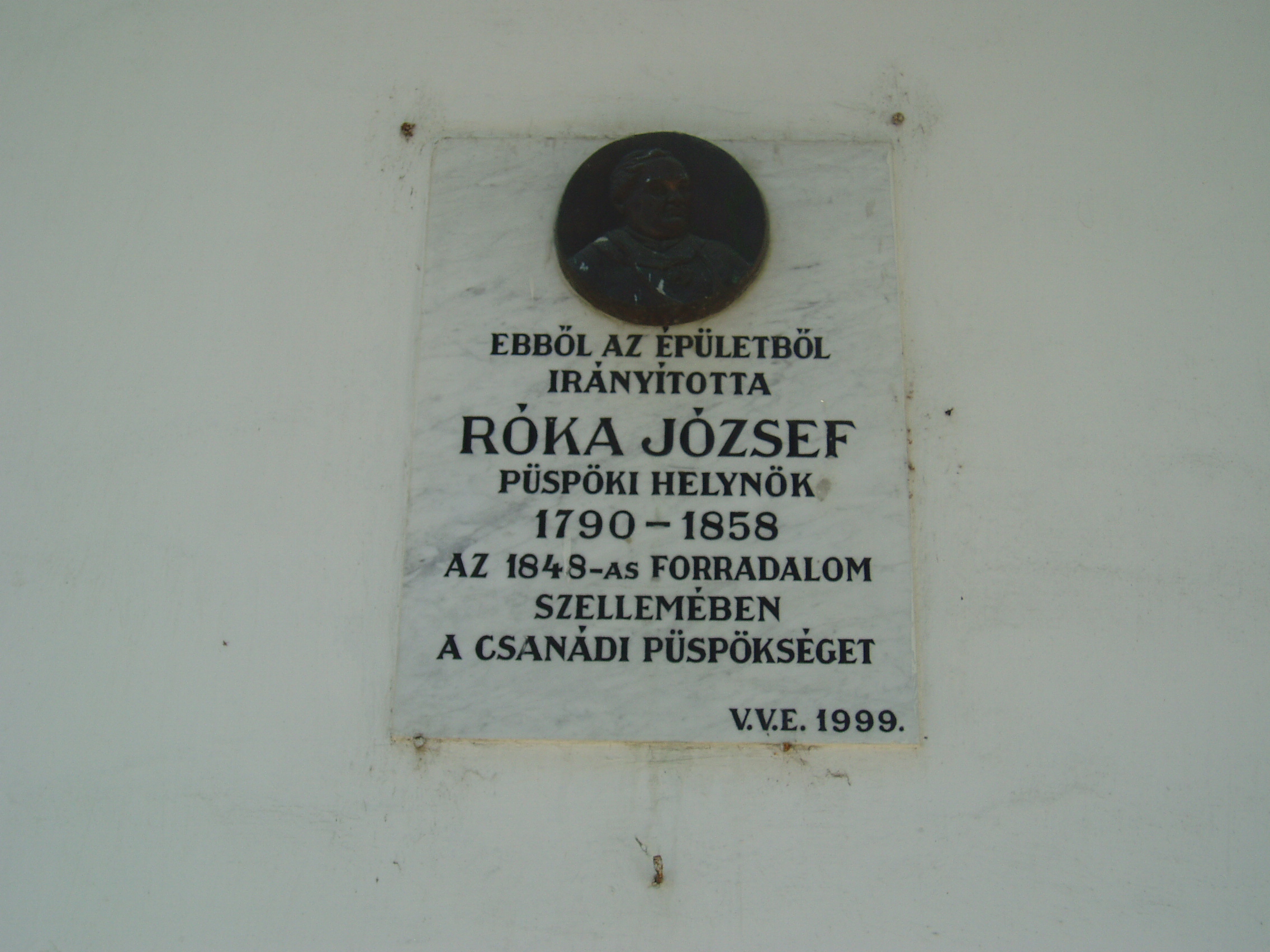 Nyilvános 1025 | 1430 | Makó, Csanád vezér tér 12. | A volt püspöki nyaralókastélyt a Temesvárott lakó Kőszeghy László csanádi püspök emeltette 1826-ban a hozzá csatlakozó dór oszlopos kápolnával együtt. A külső homlokzaton jeles, az épülethez kötődő csanádi püspökök, illetve püspöki helynök emléktábláit helyezték el. A képen Róka József (1790-1858) püspöki helynök emléktáblája látható. Az ő elnökletével nyilvánította ki a püspöki szentszék, hogy ők minden világi hatalomtól függetlenek, így a temesvári osztrák városparancsnok utasítását, miszerint tagadják meg a forradalmi kormányt, el nem fogadhatják. A címzetes püspök a püspökség székvárosában, Temesvárott maradt, Róka József pedig a szentszék jegyzőkönyveivel átköltözött Makóra, ahol a környék plébánosaiból létrehozta a szentszéket s innét irányította püspökségét. A szabadságharc bukása után Róka Józsefet kötél általi halálra ítélték, ezt 20 évi várbörtönre változtatták, majd a máriaradnai kolostorba internálták. Ott hunyt el 1858-ban. A fénykép 2007 júliusában készült. Felh. irod.: Barangolások Csongrád megyében. Miskolc, Well-PRess, 1997 Sarnyai Csaba Máté: Határozott kiállás egy történelmi pillanatban. A Csanádi Püspöki Szentszék fellépése az uralkodói manifesztummal és a császárhű temesvári katonai parancsnoksággal szemben 1848 októberében. = Korunk 2002. 7. |