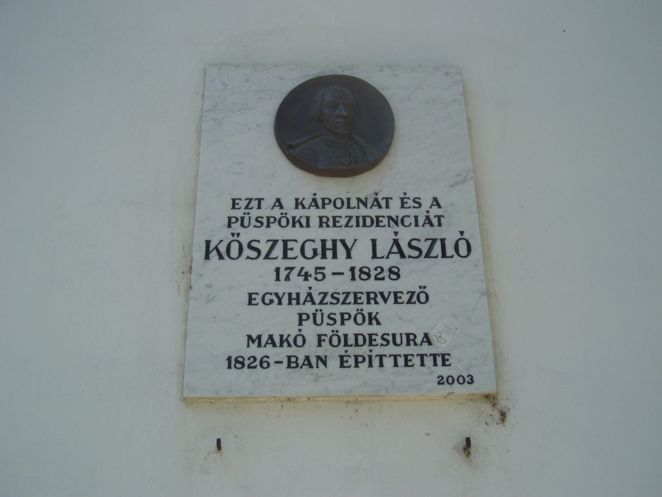 Nyilvános 949 | 1425 | Makó, Csanád vezér tér 12. | A volt püspöki nyaralókastélyt a Temesvárott lakó Kőszeghy László (1745-1828) csanádi püspök emeltette 1826-ban a hozzá csatlakozó dór oszlopos kápolnával együtt. A külső homlokzaton jeles, az épülethez kötődő csanádi püspökök, illetve püspöki helynök emléktábláit helyezték el. A képen az építtető püspök emléktáblája látható. A fénykép 2007 júliusában készült. Felh. irod.: Barangolások Csongrád megyében. Miskolc, Well-PRess, 1997 |