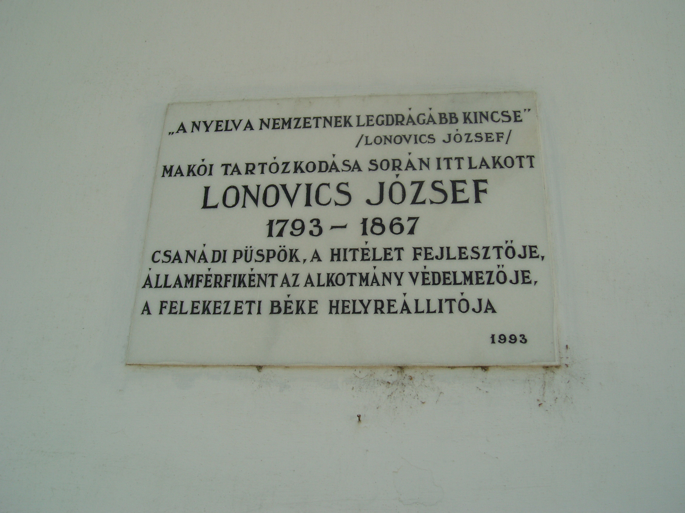 Nyilvános 1005 | 1441 | Makó, Csanád vezér tér 12. | A volt püspöki nyaralókastélyt a Temesvárott lakó Kőszeghy László csanádi püspök emeltette 1826-ban a hozzá csatlakozó dór oszlopos kápolnával együtt. A külső homlokzaton jeles, az épülethez kötődő csanádi püspökök, illetve püspöki helynök emléktábláit helyezték el. Lonovics József (1793-1867) csanádi püspök, majd egri, illetve kalocsai érsek emléktábláját születésének 200. évfordulóján állították. A fénykép 2007 júliusában készült. Felh. irod.: Barangolások Csongrád megyében. Miskolc, Well-PRess, 1997 |