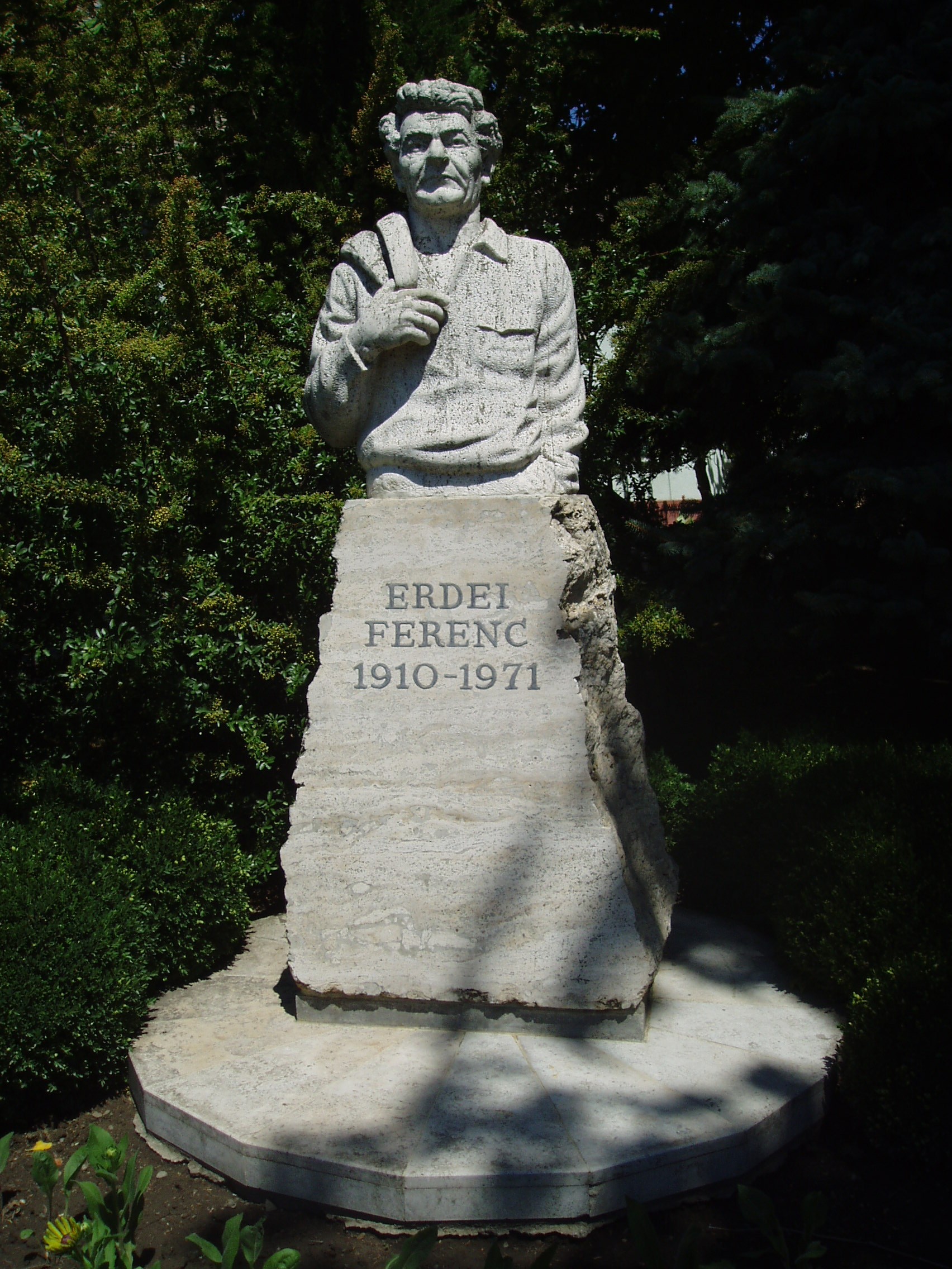 Nyilvános 1053 | 1641 | Makó, Erdei Ferenc tér: Erdei Ferenc szobra | A Megyeház utcán végigmenve jutunk az Erdei Ferenc térre. A tér 9. számú házának helyén állt valaha Erdei Ferenc (1910-1971) agrárközgazdász, politikus, szociográfus, tudományszervező szülőháza, amelyet a József Attila Múzeum udvarán (lásd: Makó, Megyeház u. 4.) udvarán rekonstruáltak. A róla elnevezett téren állították fel Makó nagy szülöttének szobrát, aki végakaratának megfelelően a közeli református temetőben nyugszik. A fénykép 2007 júliusában készült. Felh. irod.: Barangolások Csongrád megyében. Miskolc, Well-PRess, 1997 |