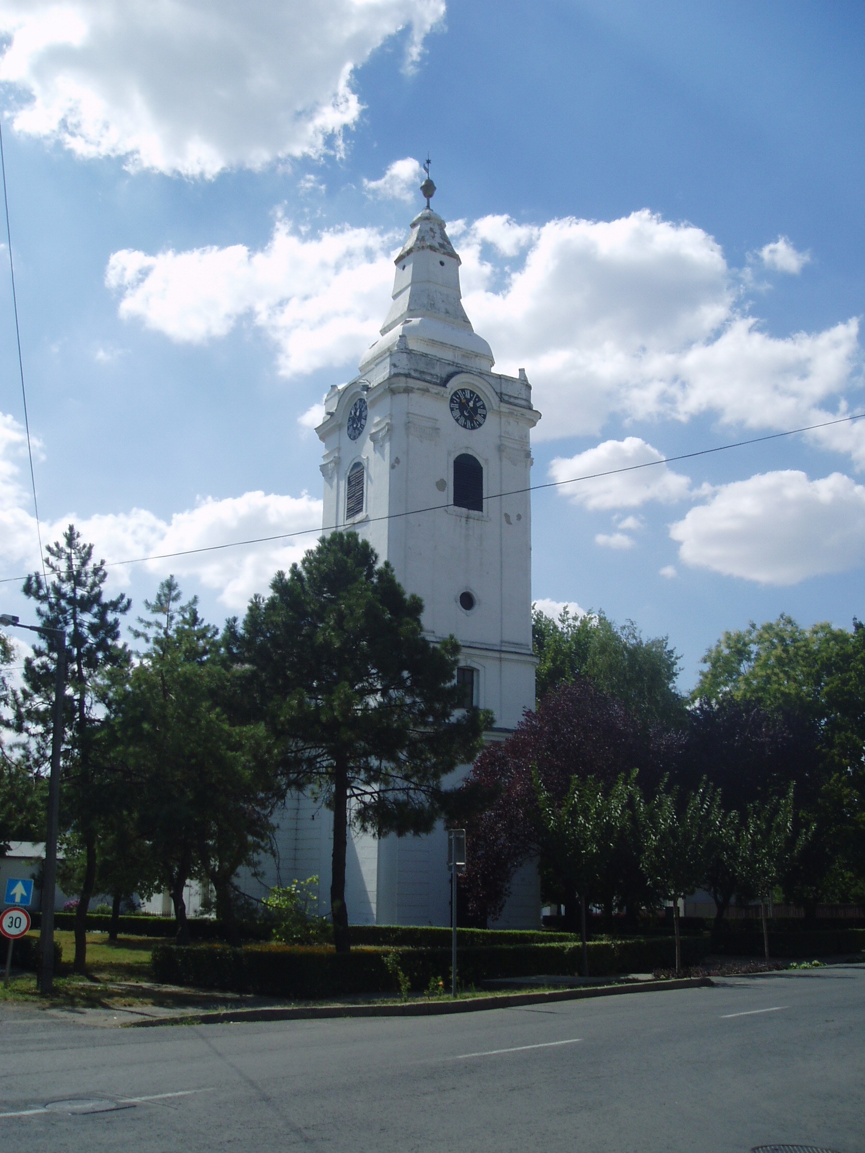 Nyilvános 991 | 1783 | Makó, Kálvin tér: Református ótemplom | Az 1776-1788 között épült ótemplom 47 méter magas tornyával a vidékies barokk stílus jellegzetes példája. Homlokzatának klasszicizáló elemei és északi harántszárnya az 1828-as átépítés eredménye. Ekkor készült faoszlopokon nyugvó, stukkódíszes mellvédű karzata és orgonája is. A szószék Erdődy Pál, a tölgyfából készült szép padok pedig Joó Sámuel helyi asztalos munkái: füzérdíszei a makói kertekben akkoriban divatos virágokat mintázzák. A fénykép 2007 júliusában készült. Felh. irod.: Barangolások Csongrád megyében. Miskolc, Well-PRess, 1997 |