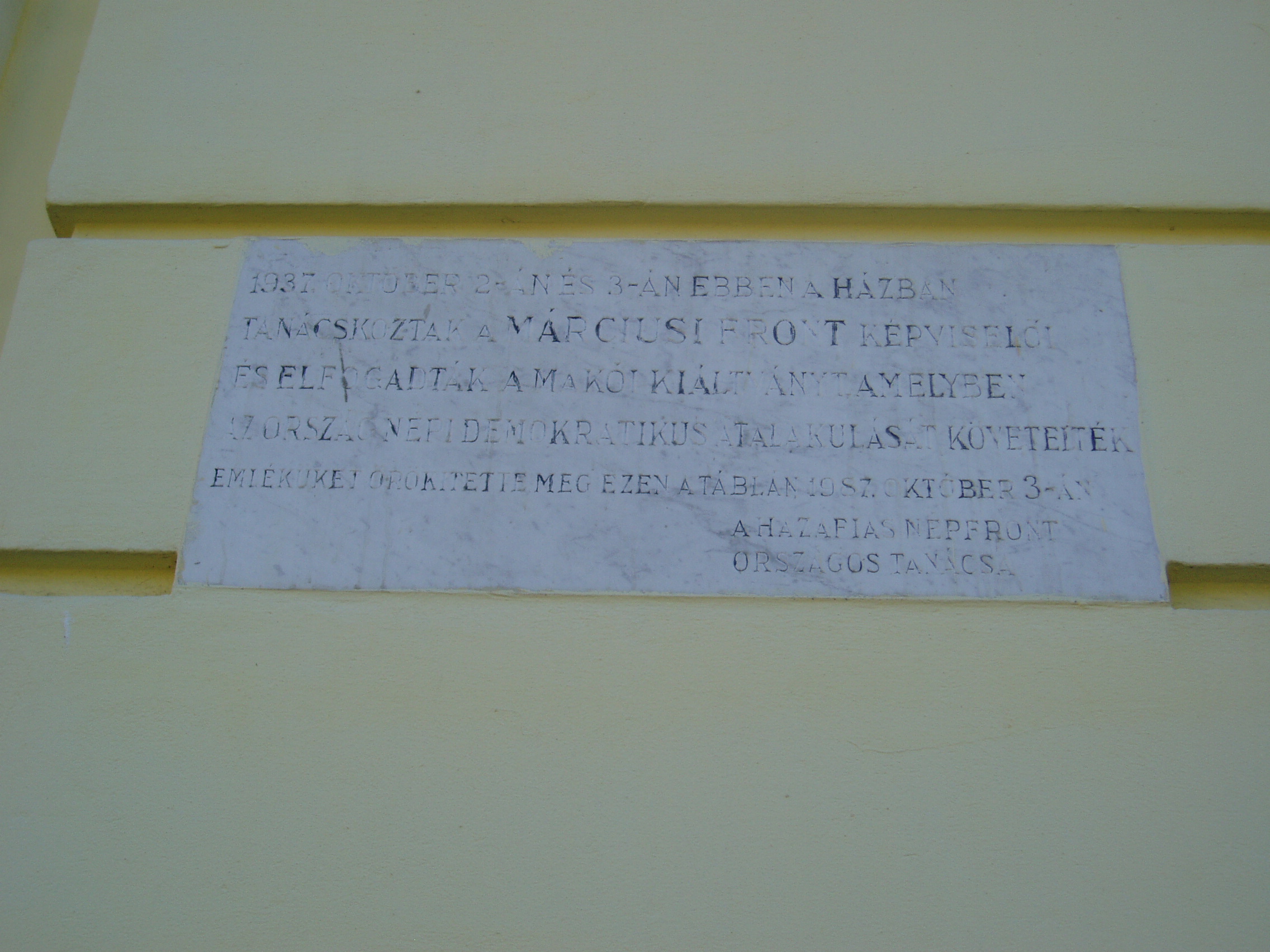 Nyilvános 955 | 1378 | Makó, Széchenyi tér 10. Korona szálló | A Korona Szálló 1855-ben épült a korábbi püspöki vendégfogadó helyére. A jelenelegi impozáns, eklektikus épület több bővítés és felújítás eredményeként jött létre. Díszterme nemcsak vigalmaknak adott helyet, gyakran tartottak itt irodalmi és más rendezvényeket is. A Válasz folyóirat irodalmi estjén 1937. február 28-án itt alakult meg a Márciusi Front, amelyre az épület homlokzatán tábla emlékezik. A fénykép 2007 júliusában készült. Felh. irod.: Barangolások Csongrád megyében. Miskolc, Well-PRess, 1997 www.mako.hu Makó története 1920-tól 1944-ig. Makó, 2004. /Makó város monográfiája 6./ |