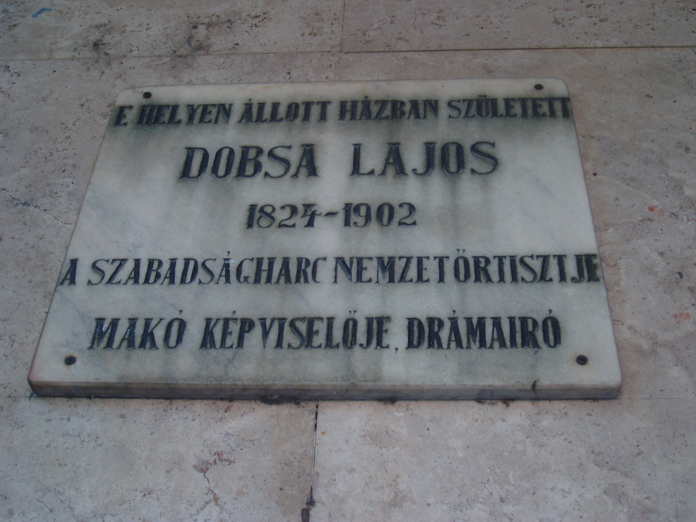 Nyilvános 964 | 1608 | Makó, Széchenyi tér 13-15. | A Széchenyi teret déli oldalról az 1970-ben épült ún. csipkeházsor határolja, földszintjén üzletekkel. Rajta feliratos tábla idézi Dobsa Lajos (1824-1902) emlékét. A drámaíró, a szabadságharc nemzetőrtisztje, Makó képviselője az egykor itt állott házban született. Dobsa fordulatos életpályát járt be: végzett jogászként 1844-ben vándorszínésznek állt. Többször vendégszerepelt a Nemzeti Színházban, de nem szerződtették. 1846-ban nyugat-európai körútra indult. 1848-ban részt vett a párizsi forradalomban, amelynek hazai krónikása lett. Hazatérése után Radicalis álnéven újságíró, a szabadságharcban kormánybiztos, majd gerillakapitány. 1850-ben a Nemzeti Színházban egy vígjátékának bemutatóján elfogták és hathavi fogságra ítélték. 1874-ig Pesten élt, 1889-től szülővárosa képviselője volt. Miután hiába próbálta megszerezni a Nemzeti Színház intendánsi posztját, visszavonult az irodalmi élettől. 1848–1895 között 14 színpadi művet írt, több drámapályázat nyertese és jutalmazottja volt. I. István király című drámája lett a szövegkönyve Erkel Ferenc utolsó operájának. A fénykép 2007 júliusában készült. Felh. irod.: Barangolások Csongrád megyében. Miskolc, Well-PRess, 1997 Magyar színházművészeti lexikon. Bp. Akadémiai Kiadó, 1994 |