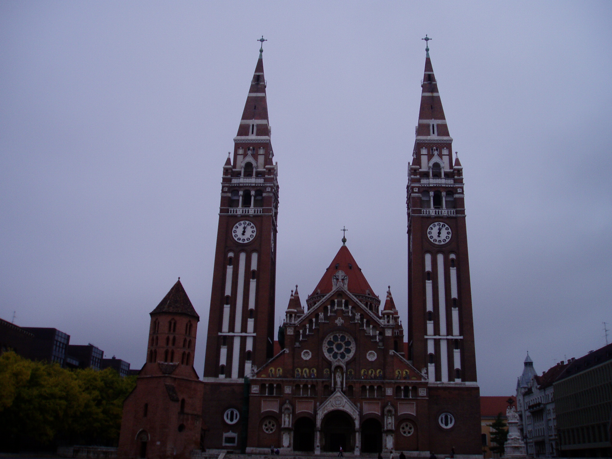 Nyilvános 945 | 1465 | Szeged, Dóm tér: Fogadalmi templom | A dóm a városkép egyik legjellemzőbb eleme, XX. századi egyházi építészetünk legmonumentálisabb alkotása, hazánk negyedik legnagyobb temploma. Építése 1913-ban kezdődött, de az I. világháború miatt csak 1930-ban szentelték fel. Valaha itt az Árpád–korból származó, azóta sokszorosan átépített Szent Dömötör–templom állott. Ennek bontásakor bukkantak Szeged legrégibb műemlékére, a román alapokon álló kora gótikus Dömötör–toronyra, amelyet 1931-ben felújítottak és keresztelőkápolnává alakítottak. A fogadalmi templom első terveit Schulek Frigyes készítette, aki a párizsi Sacre–Coeur-höz hasonlóan e templomot is fehér terméskőből akarta felépíteni. A város vezetősége — sokallva a költségeket — a terveket Foerk Ernővel módosíttatta, aki inkább a lombardiai téglaarchitektúrához vonzódott. Az 1913-ban megkezdett építkezést az I. világháború már 1914-ben félbeszakította. A tornyok addig elért magasságát a Szózat sorai jelzik, melyeket 1923-ban, az építkezés folytatásakor helyeztek el. Végül a templomot — amely közben székesegyház is lett — 1930. október 24-én szentelték fel a Magyarok Nagyasszonya tiszteletére. A Dóm tér - szépsége és akusztikai adottságai révén szinte kínálkozik monumentális rendezvények megtartására. A város messze földön ismert és nevezetes nyári színháza, a Szegedi Szabadtéri Játékok 1931-ben indult, s tette fél évszázados működése során mára az operajátszás, a zenés–táncos produkciók és a musical műfajok nevezetes helyszínévé a Dóm teret. A fénykép 2007 júliusában készült. Felh. irod.: Péter László: Szeged. Bp. Panoráma, 1981 Nikolényi István: A Szegedi Szabadtéri Játékok kézikönyve 1931–2006. Szeged, 2006 |