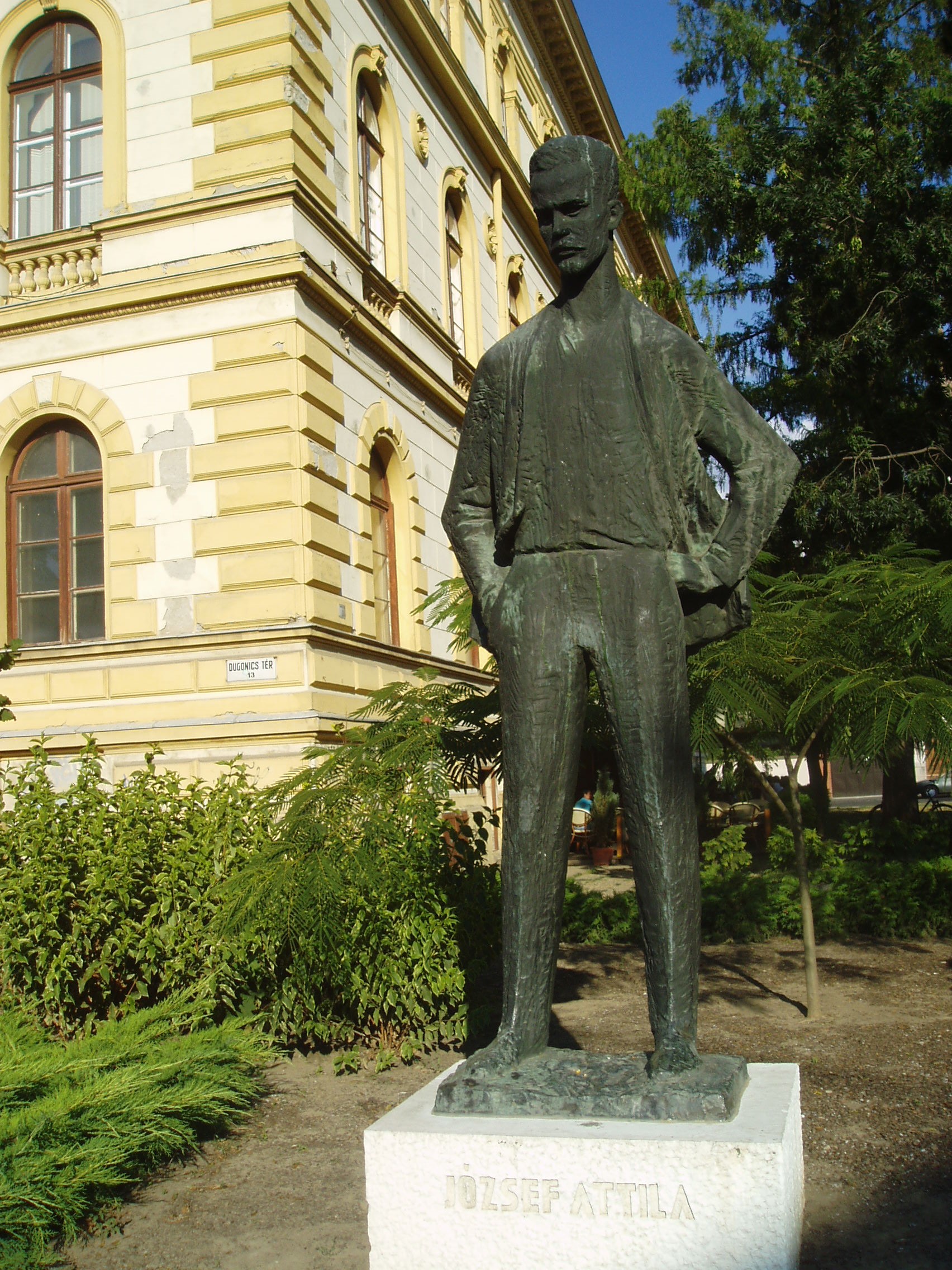 Nyilvános 971 | 1403 | Szeged, Dugonics tér 13. | A Dugonics tér keleti oldalán áll a központi egyetem klasszicista elemeket tartalmazó, kora eklektikus stílusú, védett épülete. Skalniczky Antal tervei alapján Arleth Ferenc építette 1873-ban. Az épület mind megjelenésében, mind térhatásában Szeged máig egyik legkiemelkedőbb alkotása. Eötvös József kultuszminiszter személyes helyszíni tárgyalásai alapján főreáliskolának épült, s 1880-tól helyet adott a Somogyi-könyvtárnak is. A könyvtárat Ferenc József itt nyitotta meg 1883. október 16-án. 1894-ben az épületet át kellett engedni a Szegeden három évvel korábban fölállított királyi ítélőtáblának, majd 1921-ben a Kolozsvárról áttelepült tudományegyetem költözött falai közé. 1925 őszéig itt működött a bölcsészeti kar, ide járt 1924 őszétől József Attila. Itt történt (lásd előző kép), hogy Horger Antal eltanácsolta az egyetemről a néhány nappal korábban az egyik helyi lapban megjelent Tiszta szívvel című verséért. Az épüle előtt 1964-ben állították fel Varga Imre egészalakos József Attila-szobrát. A fénykép 2007 júliusában készült. Felh. irod.: Péter László: Szeged. Bp. Panoráma, 1981 |