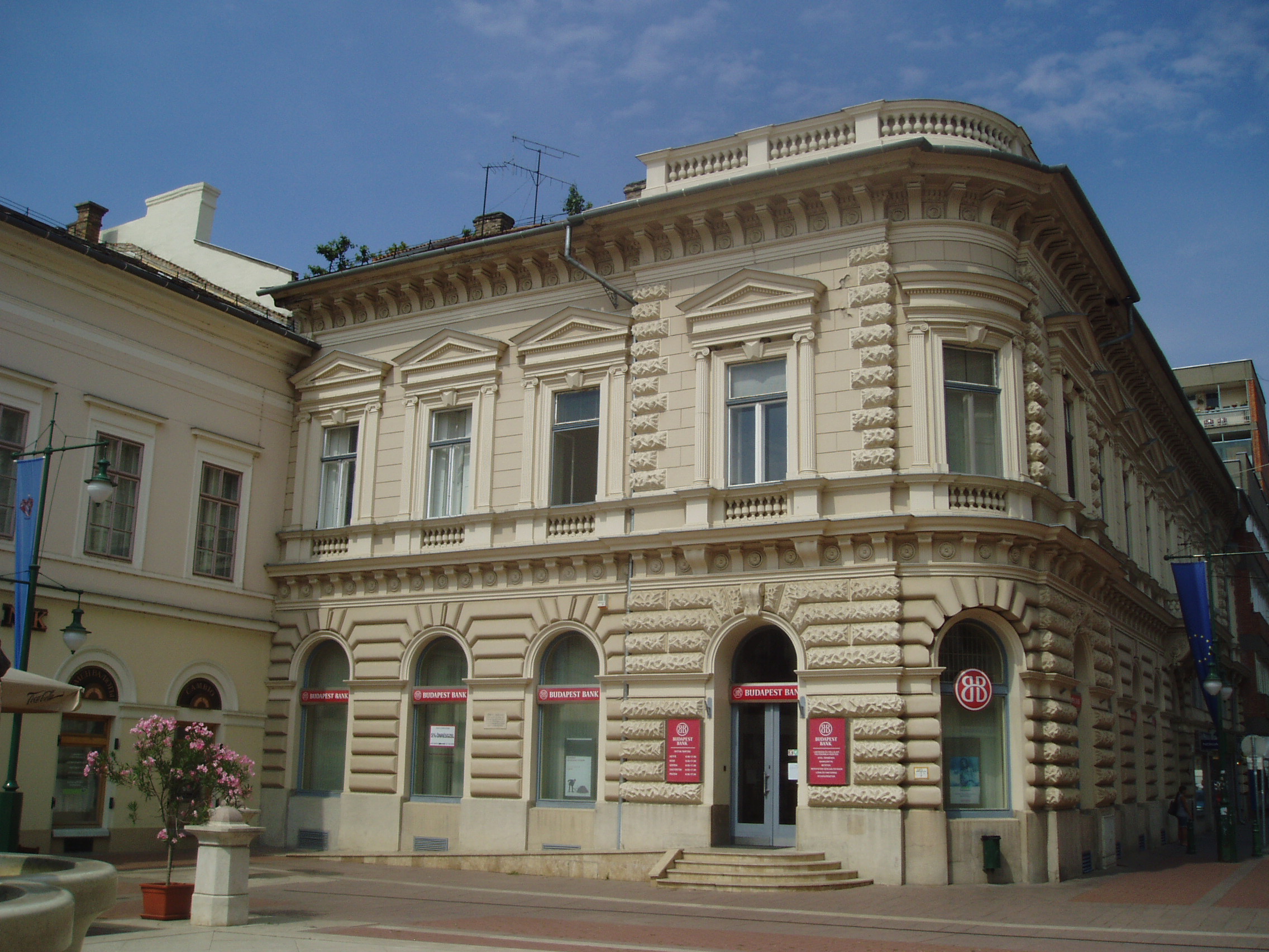 Nyilvános 941 | 1344 | Szeged, Klauzál tér 4. | A tér nyugati oldalán kiszögellő eklektikus épületben hajdan híres kávéház működött. Tulajdonosa Ströbl József, Tömörkény István anyai nagybátyja volt. A fénykép 2007 júliusában készült. Felh. irod.: Péter László: Szeged. Bp. Panoráma, 1981 |