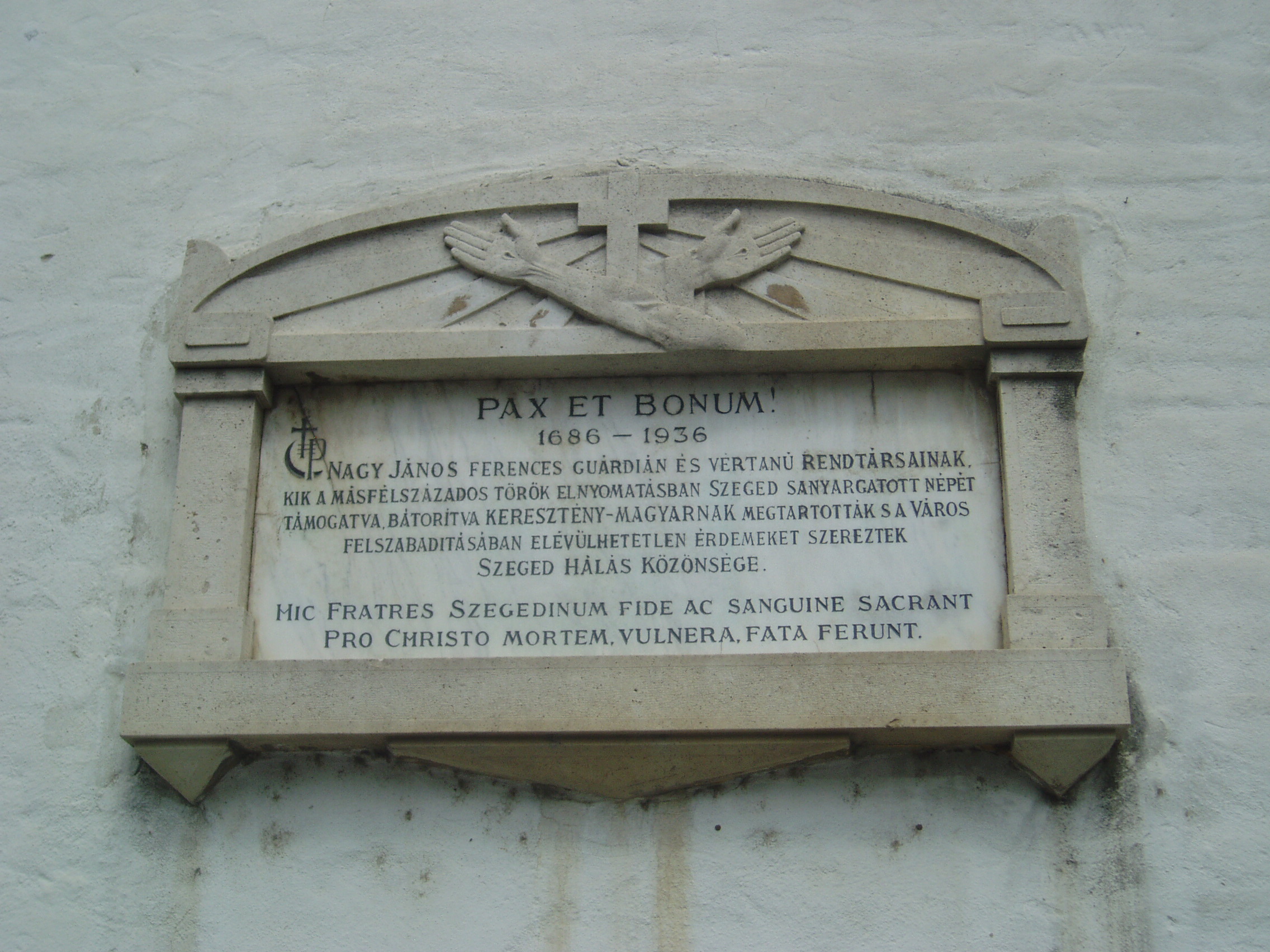 Nyilvános 967 | 1377 | Szeged, Mátyás tér: Alsóvárosi templom | A templom és szerzetesei a török hódoltság idején nagy nemzeti, anyanyelvi hivatást teljesítettek mint a Délvidék magyar népének egyedüli lelkipásztorai. Ennek az időszaknak és név szerint Nagy János rendfőnöknek állítottak emléket a templom külső homlokzatán 1936-ban elhelyezett táblával. A fénykép 2007 júliusában készült. Felh. irod.: Bálint Sándor: A Szeged-alsóvárosi templom. Bp. Pannonia, 1966 |