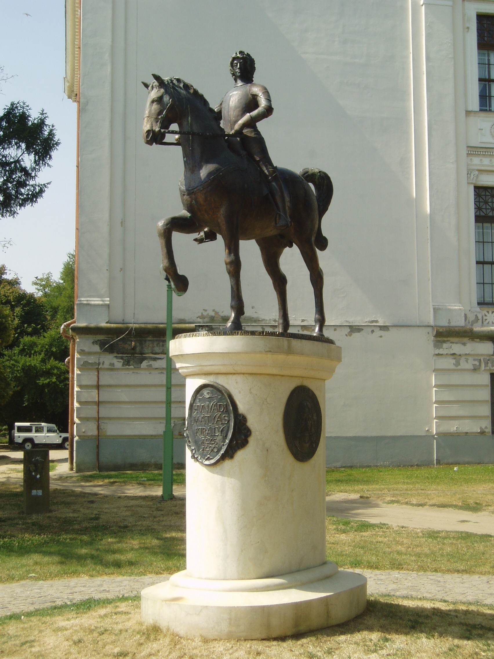 Nyilvános 1061 | 2294 | Szeged, Roosevelt tér: Mátyás király lovasszobra | A Közművelődési palota mögött, az árvízvédelmi fal kiszögellésénél, a Tisza-parton áll a 2001. augusztus 20-án átadott Hunyadi Mátyás lovasszobor, Lapis András alkotása. 1458-ban Szegeden egyeztek meg arról az ország főméltóságai, hogy a 15 éves Mátyást választják meg Magyarország királyának. A szobor talapzatának két oldalán Hunyadi János kormányzó (1407 k.–1456) és Hunyadi László (1431-1457) domborműve látható. A fénykép 2007 júliusában készült. http://users.cwi.hu/idegenvezetés |