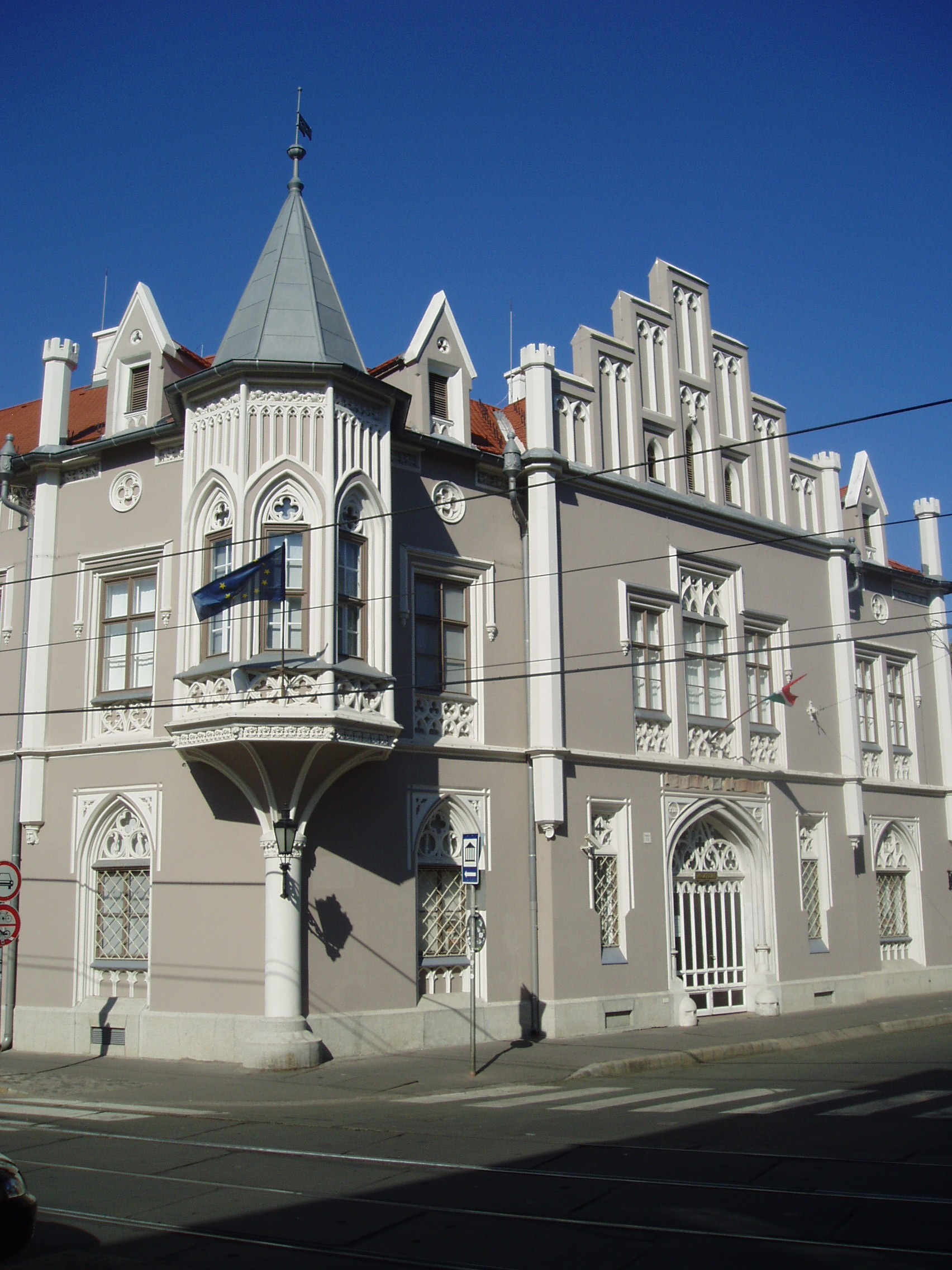Nyilvános 996 | 1377 | Szeged, Somogyi utca 13. | Az ún. Fekete ház egyemeletes, angol romantikus stílusban készült épülete a város egyik jelentős műemléke. 1857-ben emelték Gerster Károly tervei szerint. Nevét falának korábbi sötétszürke vakolatszínéről kapta. Figyelemre méltó a ház kapuja, keresztbordás kapualja és zárt sarokerkélye. 1860 és 1865 között ez volt a belvárosi kaszinó, az önkényuralommal való szembenállás fészke. Építtetője Mayer Ferdinánd (1813-1903) vaskereskedő volt. Lányai, akiknek szépségéről az akkoriban Szgeden újságíróskodó Mikszáth Kálmán azt írta, hogy még az óra is megáll, ha belépnek a szobába, a zárt erkélyen hímezgettek. S bár az öt romantikus ablakból minden irányba el lehetett látni, nekik szemlesütve kellett üldögélni. Csak férjes asszony korukban pillanthattak ki az utcára... Itt született a háztulajdonos unokája, Endre Béla (1870-1928) festőművész, aki Tornyai Jánossal együtt a hódmezővásárhelyi művészeti élet virágkorának egyik szellemi serkentője, a Művészek Majolika Telepének egyik alapító tagja volt a XX. század elején. 1917 és 1919 tavasza között ebben az épületben volt a Munkásotthon. Könyvtárszobájában alakult meg 1918. október 22-én a szegedi Nemzeti Tanács, ezért nevezte Juhász Gyula "a szegedi Pilvax"-nak. Ma a Móra Ferenc Múzeum történeti osztályának gyűjteményei és kiállításai tekinthetők meg itt. A fénykép 2007 júliusában készült. Felh. irod.: Péter László: Szeged. Bp. Panoráma, 1981 Dombai Tünde: Idén százötven éves a szegedi Fekete ház. = www.delmagyar.hu 2007. 11. 15. |