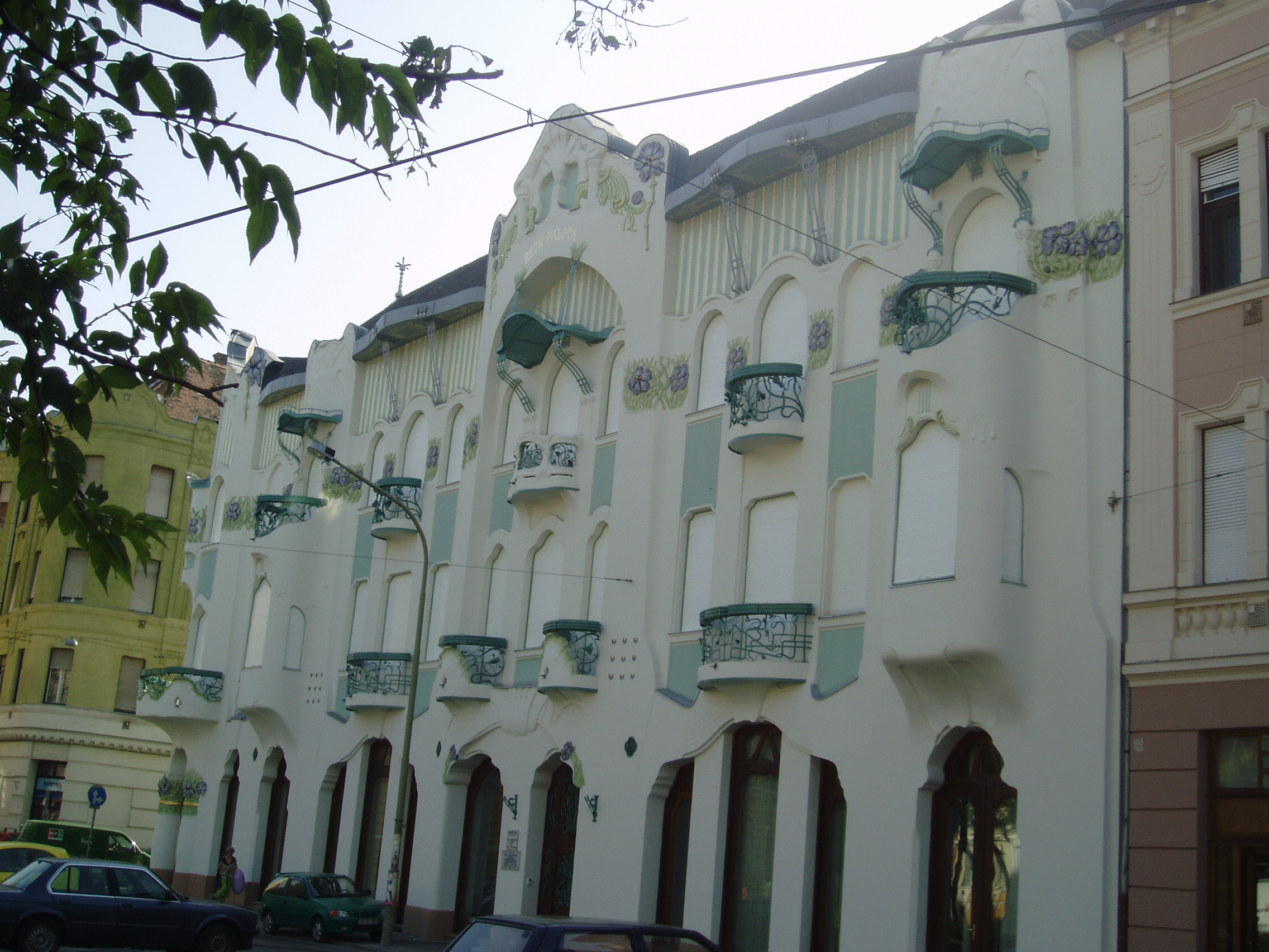 Nyilvános 1013 | 1424 | Szeged, Tisza Lajos körút 56. Reök-palota | A Reök-palota 1907-ben épült szecessziós stílusban Magyar Ede (1878-1912) tervei szerint. Tragikus fiatalon halálba ment alkotója 1901-től működött Szegeden. A jól képzett, külföldet járt fiatal építésznek második szegedi munkája volt a Reök István vízügyi mérnöktől, Munkácsy Mihály unokaöccsétől kapott megbízás. Ez az épület a hazai szecesszió egységes, tiszta stílusú megtestesülése; európai viszonylatban is a legszebbek egyike. Tagolása leginkább Gaudi lakóházainak szerkezetére emlékeztet. A homlokzaton indázó virágmotívumos díszítés a belső terekben is megtalálható, és a kovácsoltvas korlátok is ezt a mintát folytatják. A kovácsoltvas tartozékokat, amelyek a szegedi művészi vasipar csúcsteljesítményei, Fekete Pál, kitűnő szegedi kovácsművész készítette Magyar Ede rajzai alapján. Az épületet 2006-ban teljesen felújították (némely vélemény szerint új színezése nem szerencsés) és 2007. augusztus 17-én mint az "Európa Kulturális Fővárosa 2010" rendezvénysorozat Regionális Összművészeti Központja kezdte meg működését. A fénykép 2007 júliusában készült. Felh. irod.: Péter László: Szeged. Bp. Panoráma, 1981 www.puszta.com/hun/programs/cikk/reok_palota_ujjaszuletese |