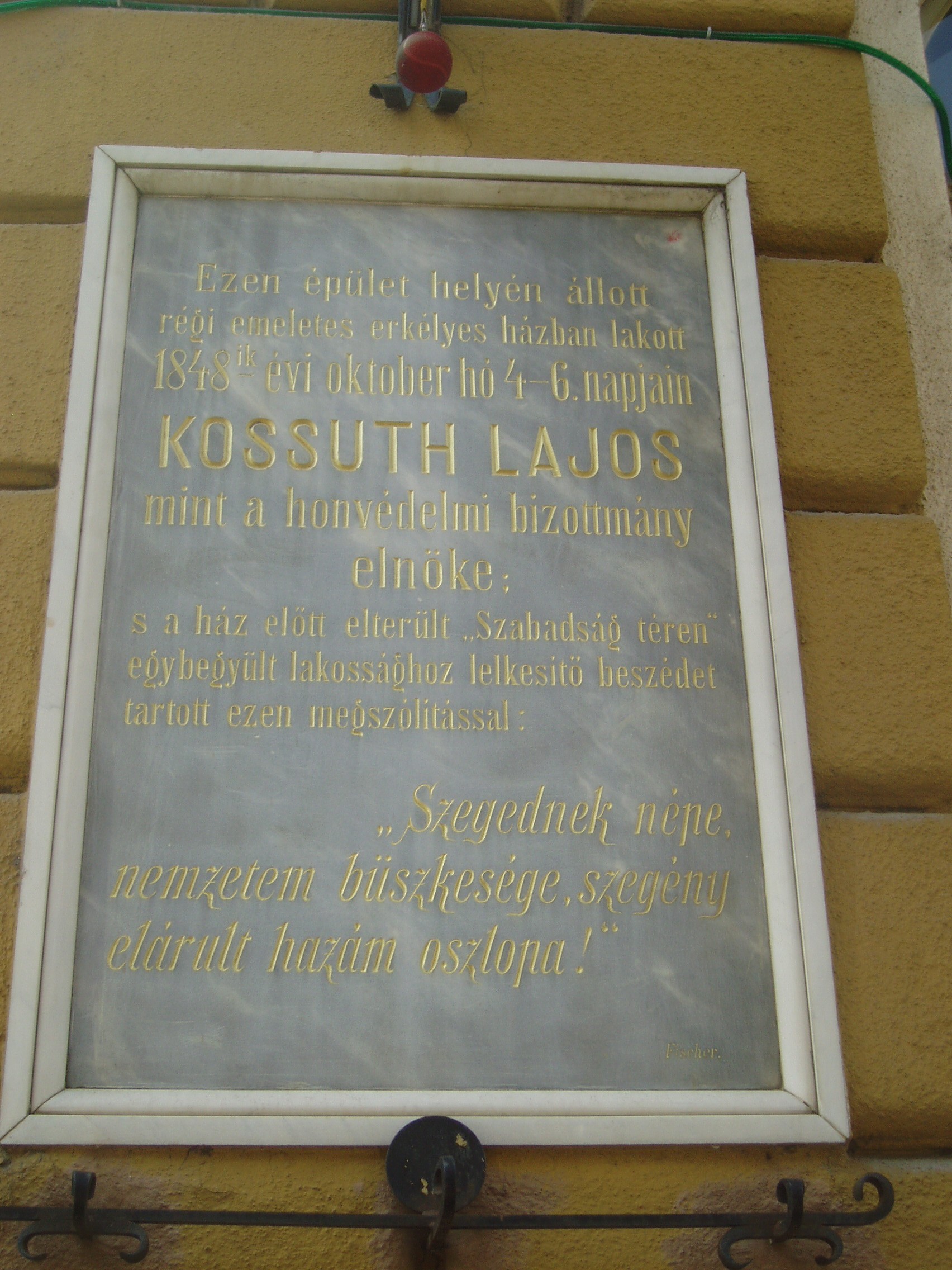 Nyilvános 1035 | 1523 | Szeged, Victor Hugo utca 6. | A mai épület helyén egykor az ún. Baurnfeind-ház állott. Itt szállt meg 1848. október 4. és 6. között Kossuth Lajos, a Honvédelmi Bizottmány elnöke. Ez elé az épület elé hozták október 4-én a Dömötör-templom szószékét, s innen mondta el Kossuth Lajos a Szabadság téren összegyűlt tömeg előtt emlékezetes toborzó beszédét: "Szegednek népe, nemzetem büszkesége, szegény elárult hazám oszlopa!" A fénykép 2007 júliusában készült. Felh. irod.: Péter László: Szeged. Bp. Panoráma, 1981 |