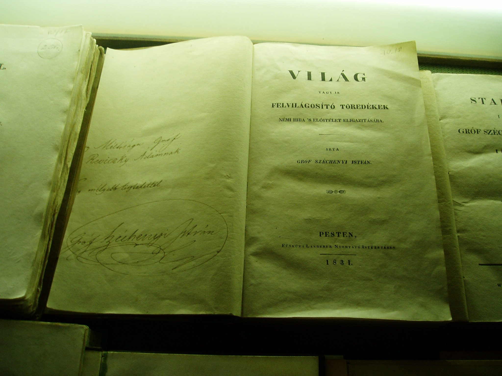 Nyilvános 1192 | 1983 | Nagycenk, Széchenyi-kastély | A barokk kastély építészeti szempontból is érdekes. Kiemelt jelentőségét azonban az adja, hogy itt élt a "legnagyobb magyarként" tisztelt Széchenyi István. A kastély ma emlékmúzeum. Az előcsarnok márvány mozaikpadlója és kandallója a kastély eredeti értékei közé tartozik. Az alsó szinten az életutat követhetjük nyomon. Az egybenyíló termek sorában elhelyezett tárgyak közül több közvetlenül Széchenyi Istvánhoz kötődik, így dolgozószobájának bútorai és íróasztala. Az ablak alatti vitrinsorban Széchenyi könyvtárából láthatunk értékes könyveket, például Világ című munkáját sajátkezű aláírásával. A fénykép 2005 júliusában készült. Felh. irod.: Látnivalók Győr-Moson-Sopron megyében. Miskolc, Well-PRess, 2000 |