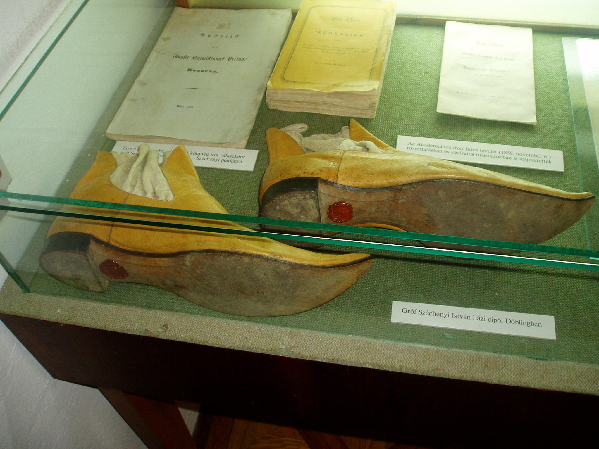 Nyilvános 1138 | 2027 | Nagycenk, Széchenyi-kastély | A barokk kastély építészeti szempontból is érdekes. Kiemelt jelentőségét azonban az adja, hogy itt élt a "legnagyobb magyarként" tisztelt Széchenyi István. A kastély ma emlékmúzeum. Az előcsarnok márvány mozaikpadlója és kandallója a kastély eredeti értékei közé tartozik. Az alsó szinten az életutat követhetjük nyomon. Az egybenyíló termek sorában elhelyezett tárgyak közül több közvetlenül Széchenyi Istvánhoz kötődik, így dolgozószobájának bútorai és íróasztala. A képen látható virtinben helyezték el Széchenyi István Döblingben használt házicipőjét más relikviák társaságában. A fénykép 2005 júliusában készült. Felh. irod.: Látnivalók Győr-Moson-Sopron megyében. Miskolc, Well-PRess, 2000 |