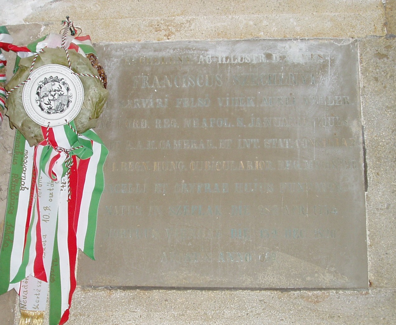Nyilvános 1160 | 2304 | Nagycenk, Mauzóleum: Széchényi Ferenc sírja | A Széchényi család nyughelyét a temető létesítésével egyidőben Széchényi Ferenc építtette 1778-ban. A barokk stílusú sírkápolnát 1806-10 között klasszicista előtérrel bővítették. A téglalap alakú előcsarnok kazettás mennyezetét ion oszlopok tartják. Az ovális alaprajzú kápolnát kupola fedi, több kutató véleménye szerint Dorffmeister István freskóival. Innen jutunk a kriptába, a család számos jeles tagjának végső nyughelyére. A képen a Nemzeti Múzeumot megalapító Széchényi Ferenc sírjának záróköve látható, latin felirattal. A fénykép 2005 júliusában készült. Felh. irod.: Látnivalók Győr-Moson-Sopron megyében. Miskolc, Well-PRess, 2000 |