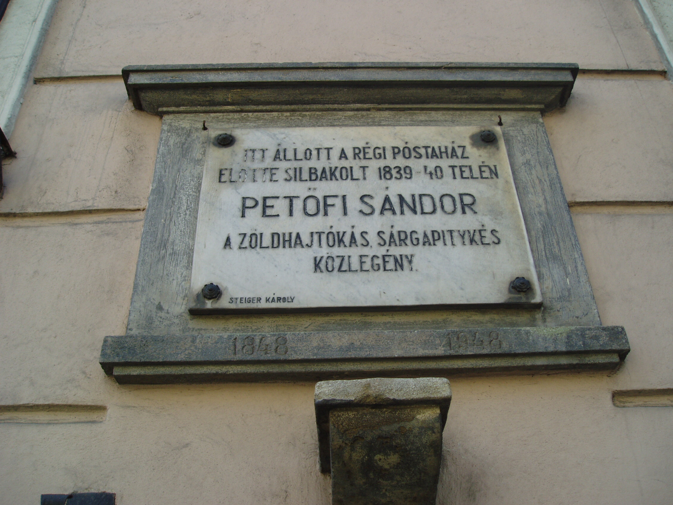 Nyilvános 1031 | 1768 | Sopron, Széchenyi tér 14. | Az épületen Petőfi Sándor emléktáblája olvasható azon a helyen, ahol a régi postaház előtt katona korában őrségben szokott állni. Petőfi 1839. szeptember 6-án hirtelen elhatározással belépett a báró goldnerfalvi Gollner Alajos tulajdonában lévő gyalogezredbe, és hat évi szerződést írt alá. A költő a zöldhajtókás, sárga pitykés, frakkszabású egyenruhát rövid ideig hordta. Betegsége miatt 1841. februárban felmentették a szolgálat alól, és obsittal elbocsátották, majd 1841. március elején elhagyta a várost. Ma e hely közelében szobra is áll. A fénykép 2006 áprilisában készült. Felh. irod.: Czellár Katalin: Sopron. Bp. Panoráma, 1988 |
