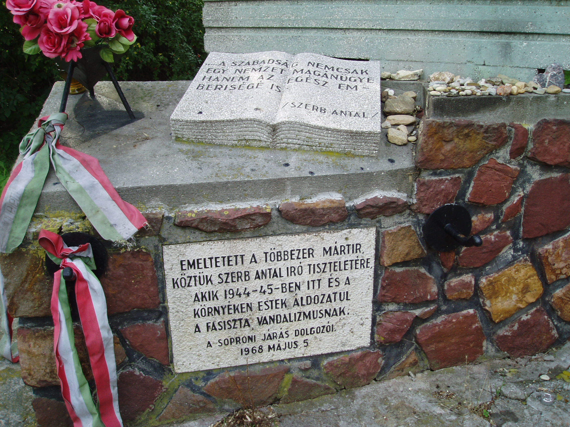 Nyilvános 1552 | 3858 | Balf, Temető: Mártíremlékmű | A II. világháborúban munkaszolgálatos tábort rendeztek be Balfon, ahol mintegy 2000 ember lelte halálát, közöttük Szerb Antal író, irodalomtörténész és Sárközi György író, költő. A Fodor János szobrászművész által készített emlékművet 1968-ban emelték az áldozatok tiszteletére a balfi régi temető kapujának közelében. Felirata Szerb Antal jelmondata: "A szabadság nemcsak egy nemzet magánügye, hanem az egész emberiségé." A fénykép 2005. szeptemberében készült. Felh. irod.: Látnivalók Győr-Moson-Sopron megyében. Miskolc, Well-PRess, 2000 |