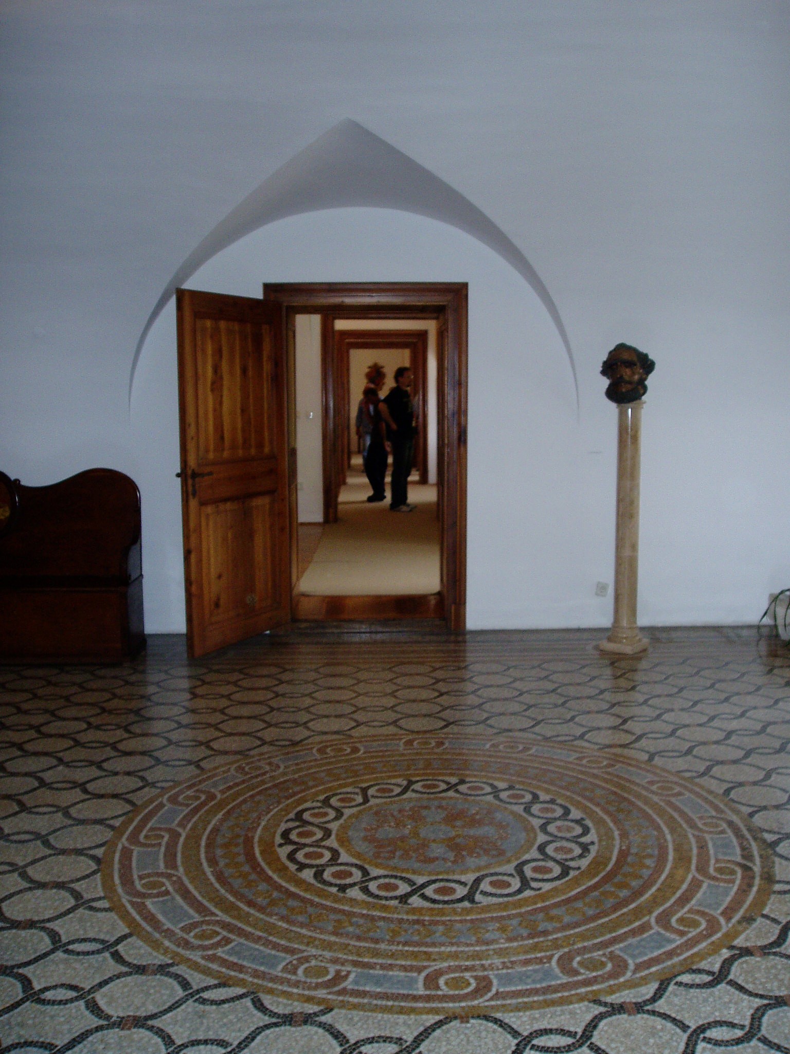Nyilvános 1159 | 2163 | Nagycenk, Széchenyi-kastély | A barokk kastély építészeti szempontból is érdekes. Kiemelt jelentőségét azonban az adja, hogy itt élt a "legnagyobb magyarként" tisztelt Széchenyi István. A kastély ma emlékmúzeum. Az előcsarnok márvány mozaikpadlója a kastély eredeti értékei közé tartozik. A fénykép 2005 júliusában készült. Felh. irod.: Látnivalók Győr-Moson-Sopron megyében. Miskolc, Well-PRess, 2000 |