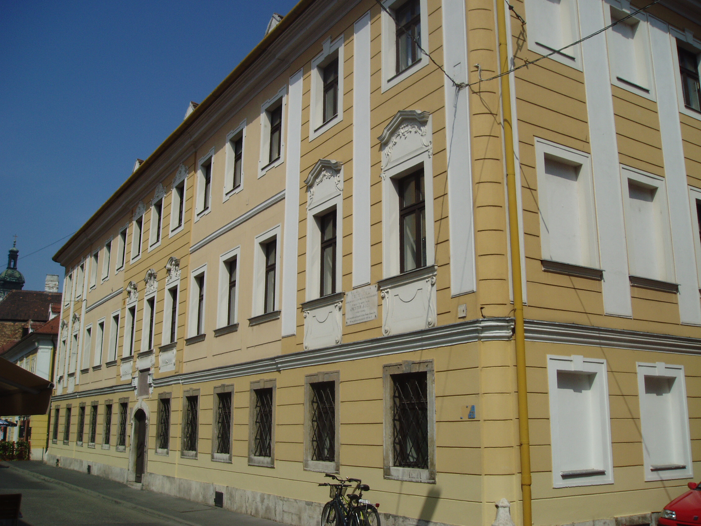 Nyilvános 1079 | 1727 | Győr, Apáca utca 5. Káptalani zenészek háza | A XVI. század első felében ezen a telken a városháza állott. Abban rendezték be a a székeskáptalan által fenntartott XVI–XVII. századi „magyar iskolát”, amelyet káptalandombi otthonából a német katonaság üldözött el. Az ekkor már kétemeletes épület az iskola mellett a székesegyházi (lásd: Győr, Káptalandomb: Székesegyház) muzsikusoknak is otthona lett, mint a Káptalani zenészek háza. Lakott benne Istvánffy Benedek, aki 1778 előtt működött a székesegyház zenei vezetőjeként, majd 1832 és 1854 között itt lakott Richter Antal. Felesége nagyszerű énekesnő volt. 1843. április 4-én ebben a házban született fiuk, Richter János (Hans Richter), a későbbi legendás Wagner–karmester. A felvétel 2008 május végén készült. Felh. irod.: Cziglényi László: Győr. Bp. Panoráma, 1981 Orbánné Horváth Márta: Emlékművek, emléktáblák győri kislexikona. Győr, Városi Könyvtár, 2001 Vavrinecz Veronika: Richter Antal (1802–1854) élete és működése. 2003, Szkarabeusz Kiadó |