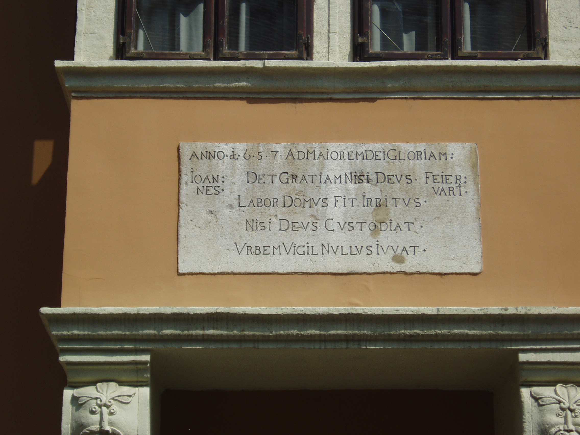 Nyilvános 1035 | 1561 | Győr, Apáca utca 9. Fejérvári-ház | Győr egyik legpatinásabb épületét 1657-ben emelték, amint a homlokzatán elhelyezett latin nyelvű emléktáblán is olvasható, majd 1770 körül átalakították. A későreneszánsz-korabarokk ház kapujának zárókövén a Fejérvári család címere, egy csőrében patkót tartó vadliba látható. Első emeleti zárt erkélye maszkban végződő csigavonalas konzolokon nyugszik. A felvétel 2008 május végén készült. Felh. irod.: Cziglényi László: Győr. Bp. Panoráma, 1981 |