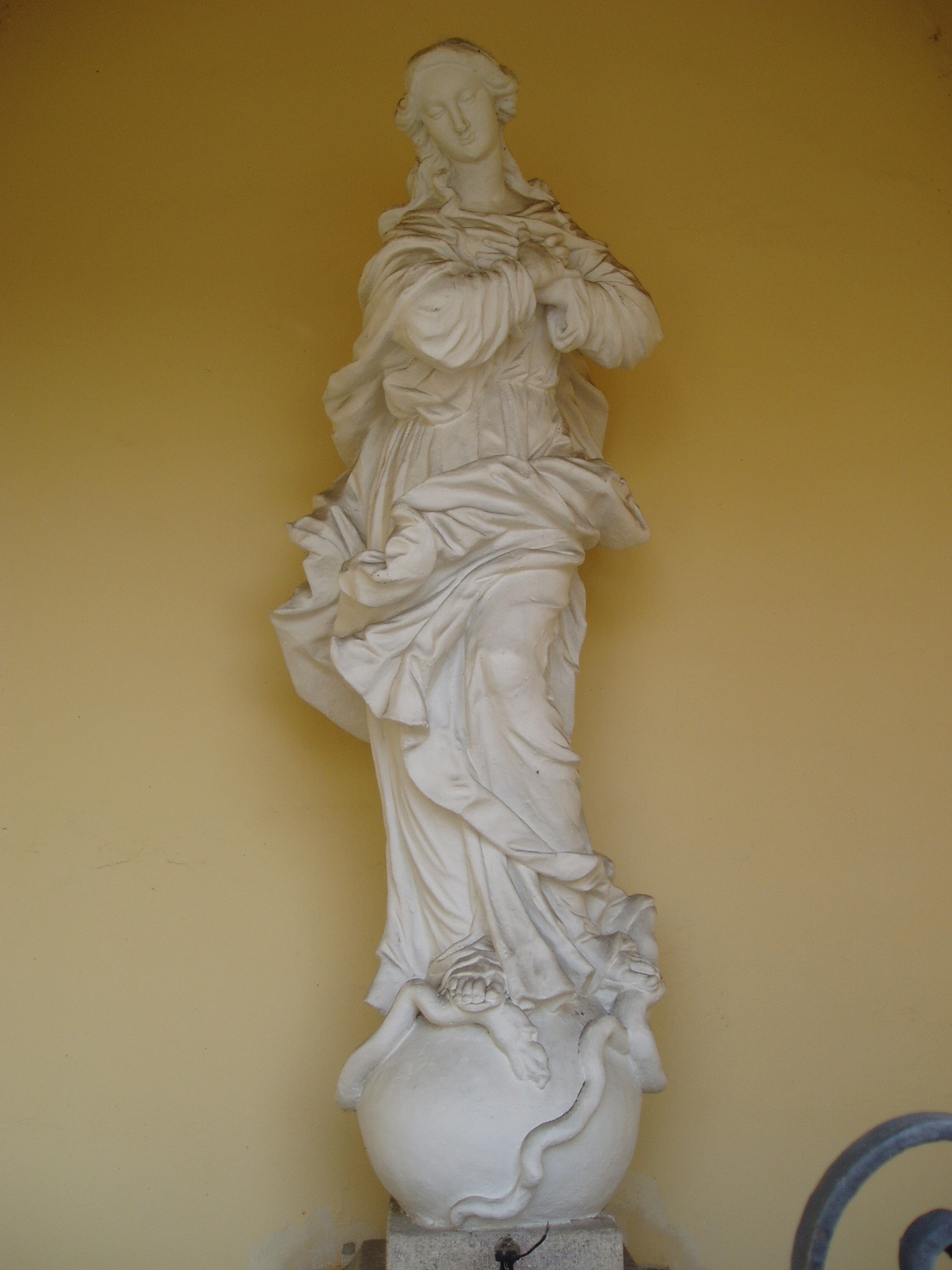 Nyilvános 1052 | 1548 | Győr, Bécsi kapu tér: Karmelita templom | A templomból a főkapun kijövet balról, egy régi oltárfülkében áll a Hab Mária-szobor, amely hozzáértők szerint Győr legszebb barokk szoboralkotása. Eredetileg a Rába szigetén állott árvízi emlékként. A XVII. század közepe óta ismert szobor alkotójának Giovanni Giulianit tartják. A felvétel 2008 május végén készült. Felh. irod.: Cziglényi László: Győr. Bp. Panoráma, 1981 |