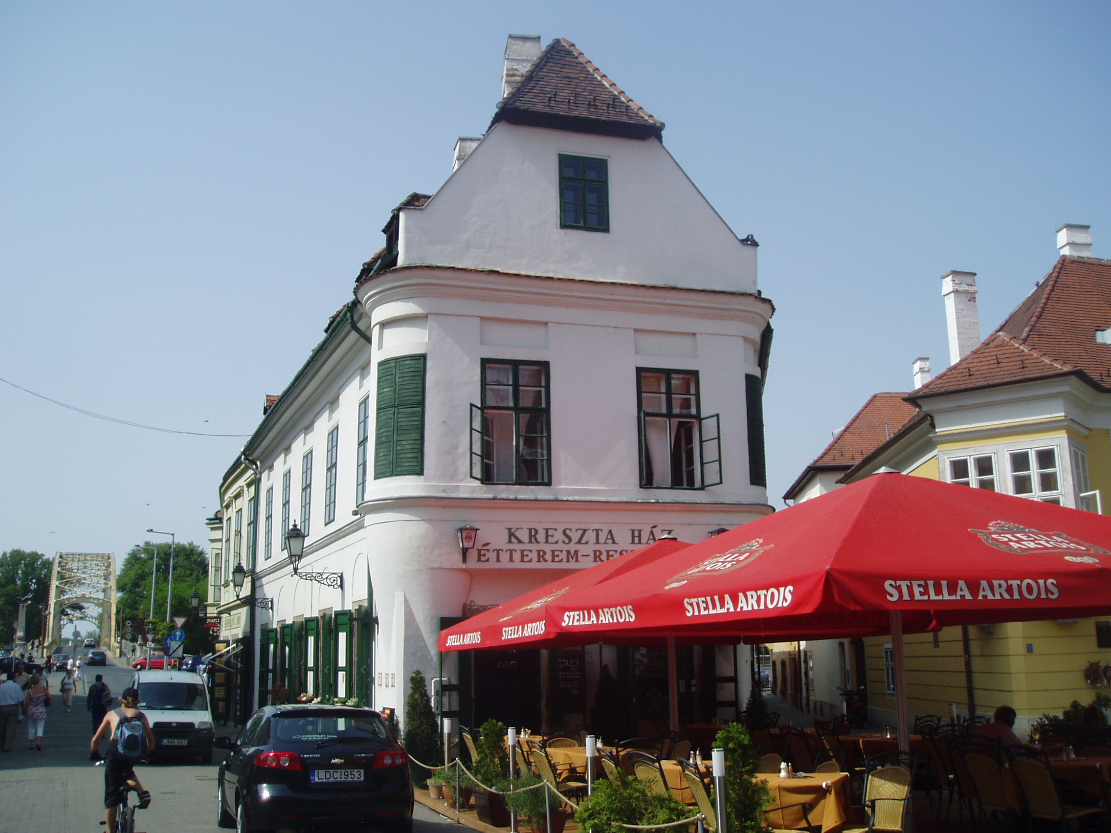 Nyilvános 1002 | 1530 | Győr, Jedlik Ányos utca 3. Kreszta-ház | Az épületet, bár a XVIII. század elején épült, sokan középkori eredetűnek hiszik kontytetős oromzata és kiugró emeleti homlokzata miatt. Három utcára néző homlokzata klasszicista stílusú. Utolsó tulajdonosa, a Kreszta kereskedőcsalád után kapta ma is használatos nevét. Itt kapott helyet a győri születésű Kovács Margit állandó kiállítása. Az épületbelsőben sajnos nem lehet fényképezni. A felvétel 2008 május végén készült. Felh. irod.: Cziglényi László: Győr. Bp. Panoráma, 1981 |