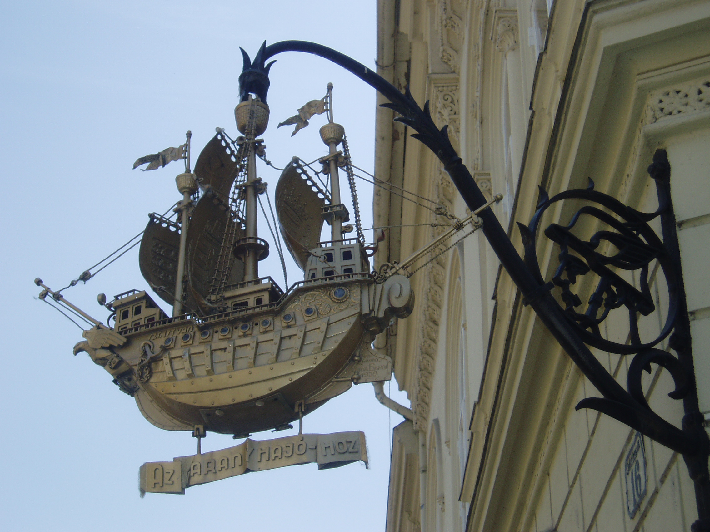 Nyilvános 1023 | 1863 | Győr, Jedlik Ányos utca 6. Aranyhajó cégér másolata | A Xantus János Múzeumban látható eredeti cégér fémlemezből készült, aranyozott hajótest a XV. századi caravellák mintájára. Az árbocokhoz futó kötélzet végén akasztó kampóval. Eredetileg a jelenlegi Széchenyi tér 1. sz. házon függött, egy fűszer- és gyarmatárú üzlet cégére volt. 1847-ben Haagen Ferenc Károly, 1863-ban Eitner L. és Vollnhofer, 1864-ben Vollhofner F.G. volt a tulajdonosa. Amikor új háza felépült a Dr Kovács Pál és a Jedlik Ányos utca sarkán, e házra helyezte át a cégért. Helyére 1939-ben Schima Bandi győri műkovács mester által készített másolatot helyezték el. A felvétel 2008 május végén készült. Felh. irod.: http://www.gymsmuzeum.hu |