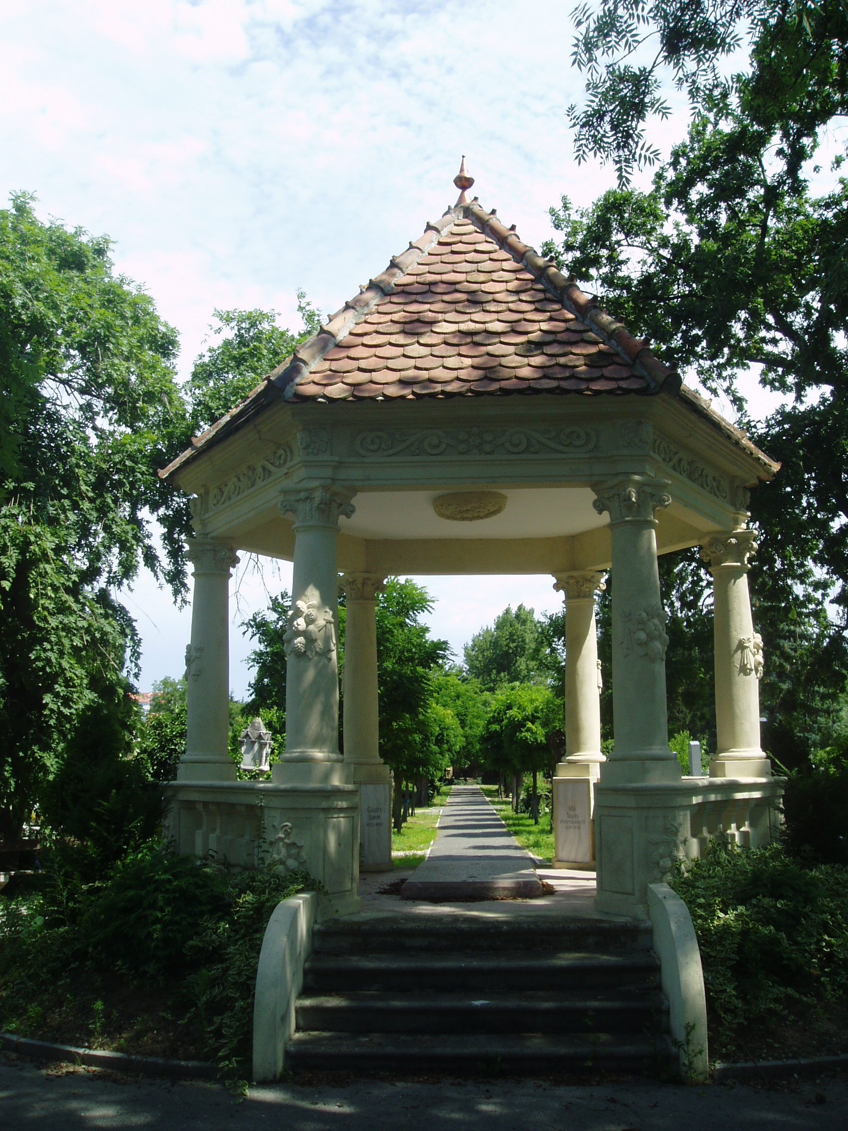 Nyilvános 1045 | 1789 | Sopron, Balfi út. Evangélikus temető. Gálffy Ádám sírboltja | A soproni evangélikusok 1674-ben nyitották meg temetőjüket, korábban a katolikusokkal együtt a Szent Mihály temetőbe temetkeztek. Az 1686-ban elhunyt Gálffy Ádám mellett ide temették az evangélikus egyház nevesebb lelkészeit is: a történetíró Gamauf Teofilt és Kis János költőt. A sírbolt egy hatszögletes, nyitott csarnok, amelyet kőkorlát szegélyez, ezen oszlopok emelkednek. Az építményt cseréptető fedi. Padlójában,amelyhez néhány lépcsőfok vezet, Gálffy epitáfiuma látható. Gálffy Ádám gazdag soproni polgár, földbirtokos, kereskedő volt, aki nagyértékű kegyszergyűjteményt ajándékozott az evangélikus gyülekezetnek. A fénykép 2008 júniusában készült. Felh. irod.: Czellár Katalin: Sopron. 3. jav. kiad. Bp. Panoráma, 2000 |