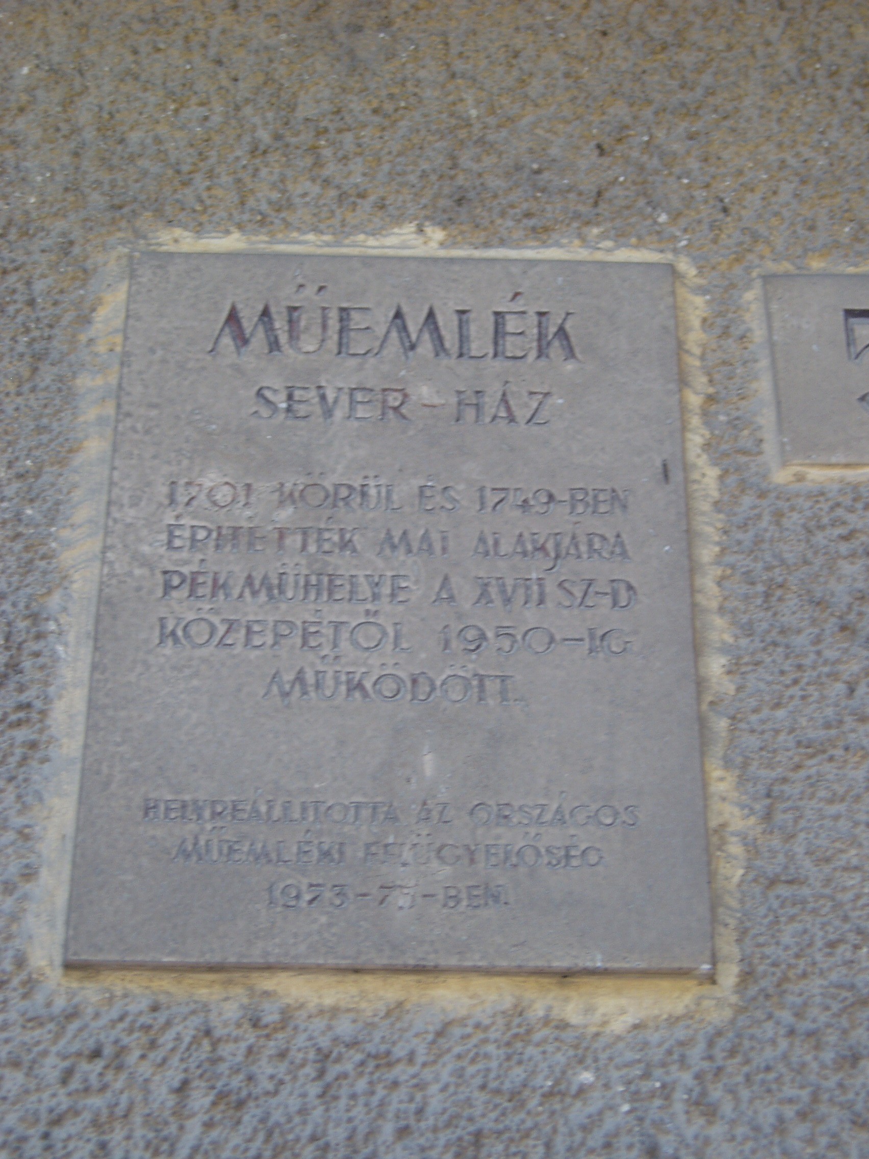 Nyilvános 1065 | 1675 | Sopron, Bécsi út 5. | Stílszerűen pékmúzeum működik az egyszerű, földszintes barokk lakóházban, amelynek tulajdonosai a XVII. század közepétől pékmesterek voltak, s melyben egészen 1950-ig folyamatosan pékség működött. Az épület 1700, majd 1749 körüli átalakításakor nyerte el mai formáját. Homlokzatát 1663-ból származó pékcímer díszíti: egy kettős zsemlyén álló, perecet tartó oroszlán. A fénykép 2008 júniusában készült. Felh. irod.: Czellár Katalin: Sopron. 3. jav. kiad. Bp. Panoráma, 2000 |