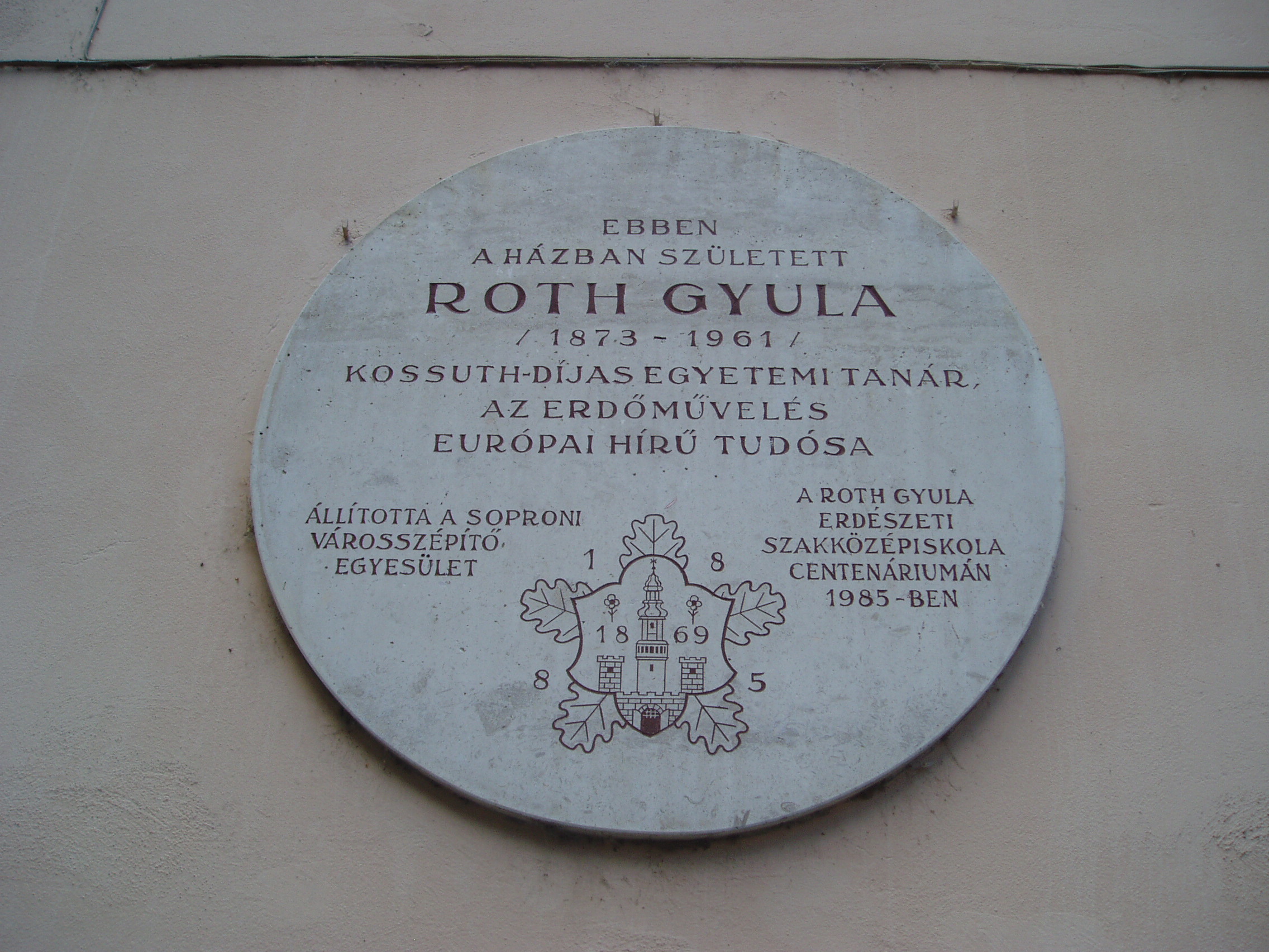 Nyilvános 1020 | 1508 | Sopron, Előkapu 3. | Sopron belvárosának főbejárata az északon nyíló Előkapu. Helye már a római korban lakott volt, majd a középkorban erődítésrendszert alakítottak itt ki. A területet a XVIII. század közepétől kezdték beépíteni lakóházakkal. A homlokzaton elhelyezett emléktábla tanúsága szerint a 3. szám alatt született Roth Gyula (1873-1961) Kossuth-díjas egyetemi tanár, az erdőművelés európai hírű tudósa. A fénykép 2008 júniusában készült. Felh. irod.: Czellár Katalin: Sopron. 3. jav. kiad. Bp. Panoráma, 2000 |