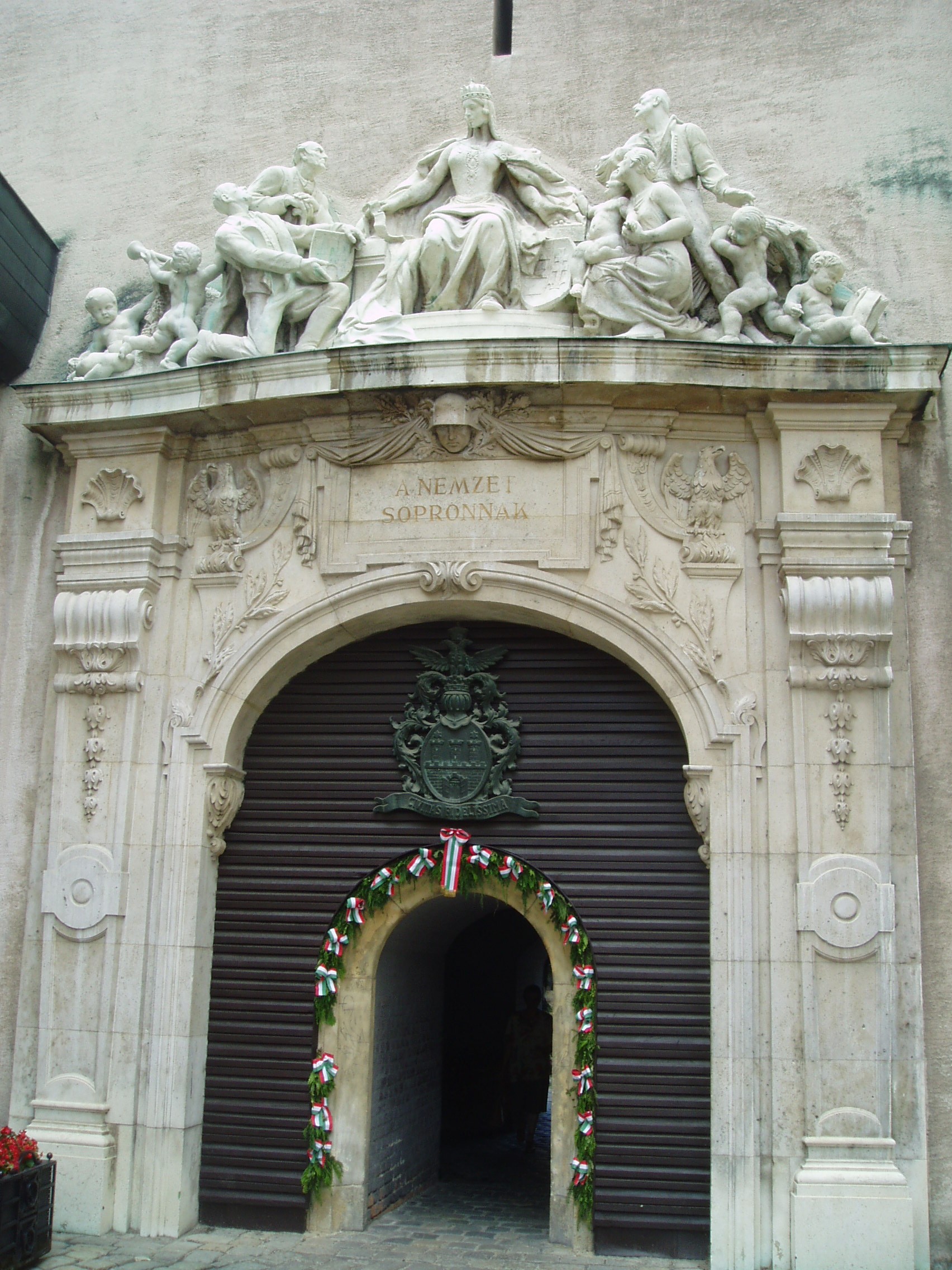 Nyilvános 1049 | 1765 | Sopron, Előkapu: Tűztorony | Sopron jelképe a város messzire ellátszó, legmagasabb építménye. Első írásos említése 1409-ből való. Magassága akkor körülbelül a mai loggiáig terjedt, ahol akkor is erkély volt. 1676-ban leégett, és csak 1681-ben építették újjá. A XIX.század végén az új városháza építésekor csaknem lebontották. 1928-ban átjárója köré és fölé a nemzet ajándékaként Kisfaludi Strobl Zsigmond és Hikisch Rezső népszavazási emlékműve került. Évszázadokon át a szabad királyi városokra jellemző toronyzene helyszíne volt. A kép 2008 júniusában készült. Felh. irod.: Czellár Katalin: Sopron. 3. jav. kiad. Bp. Panoráma, 2000 |