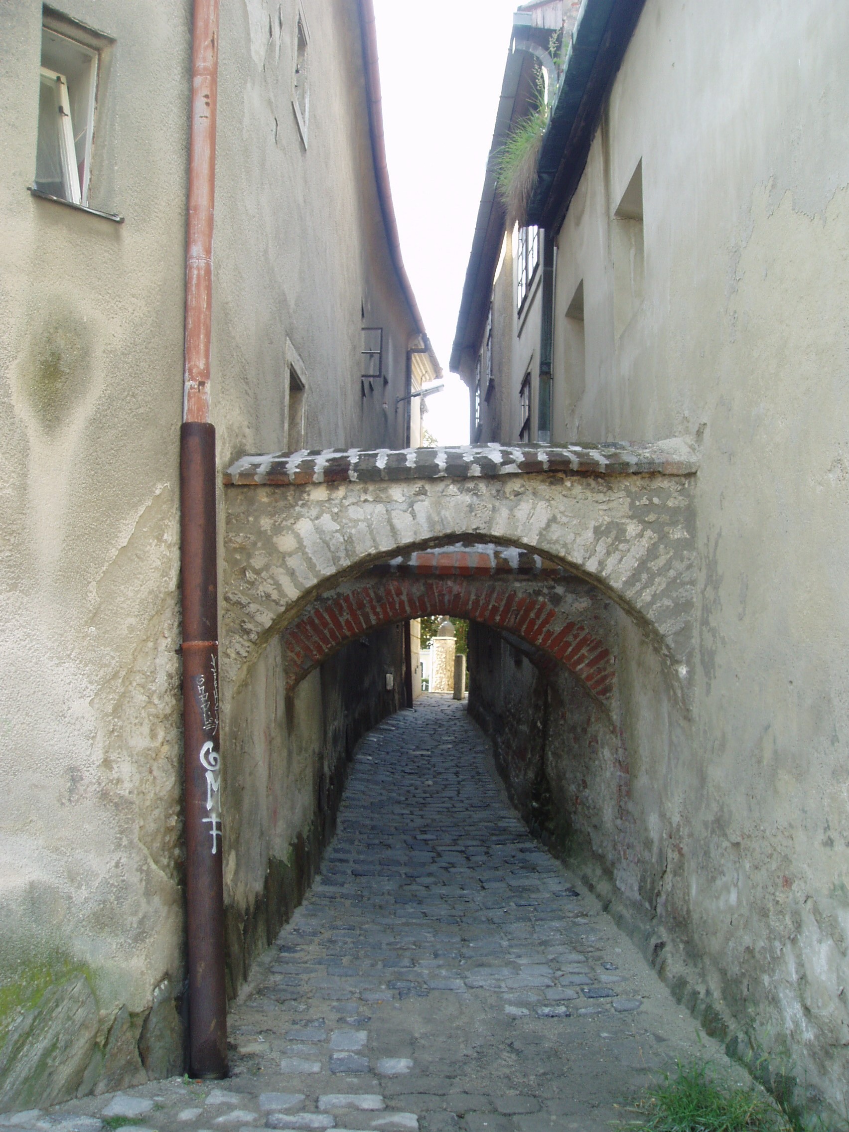 Nyilvános 1056 | 2115 | Sopron, Festő köz | A Várkerület 7. számú ház előtt nyílik a hangulatos Festő köz, mely a Sopront átszelő Ikva-patakhoz vezet. Valaha erre laktak a város posztónyírói, tímárjai, kékfestői. A kis sikátor onnét kapta a nevét, hogy a kékfestők rajta keresztül vitték szárítani vásznaikat a városi Festőház padlására. A fénykép 2008 júniusában készült. Felh. irod.: Czellár Katalin: Sopron. 3. jav. kiad. Bp. Panoráma, 2000 |